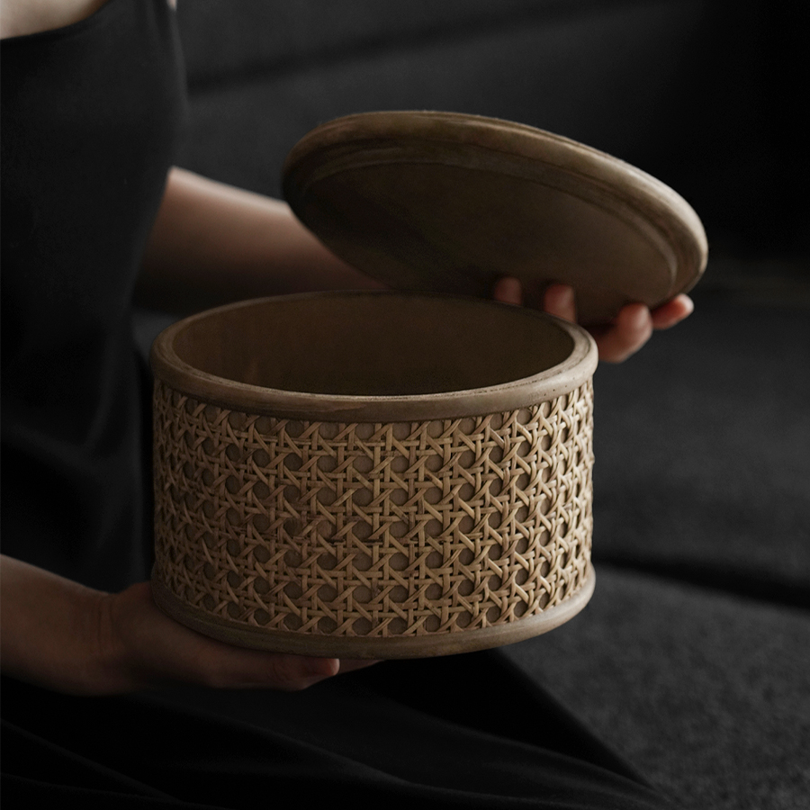 栗石复古新中式藤编收纳盒化妆品杂物钥匙置物盒带盖子防尘收纳筐