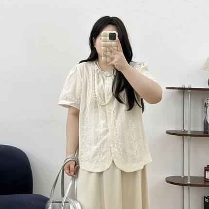 宛宛大码女装夏季新款显瘦遮肉上衣胖mm法式蕾丝漂亮雪纺短袖衬衫
