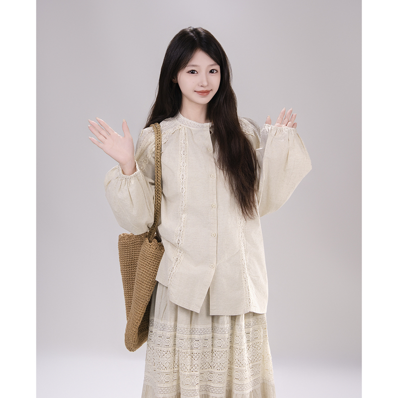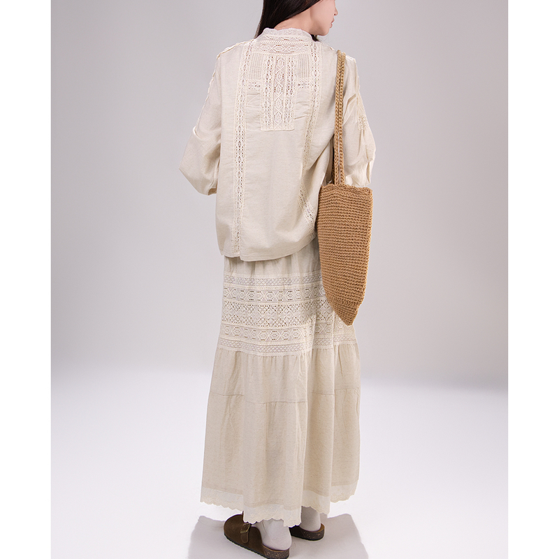 艺野系文艺复古重工蕾丝拼接棉麻衬衫半身裙两件套女减龄森系套装