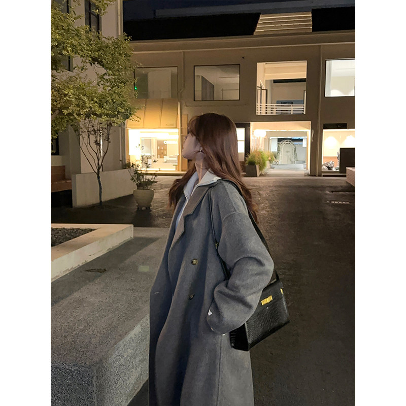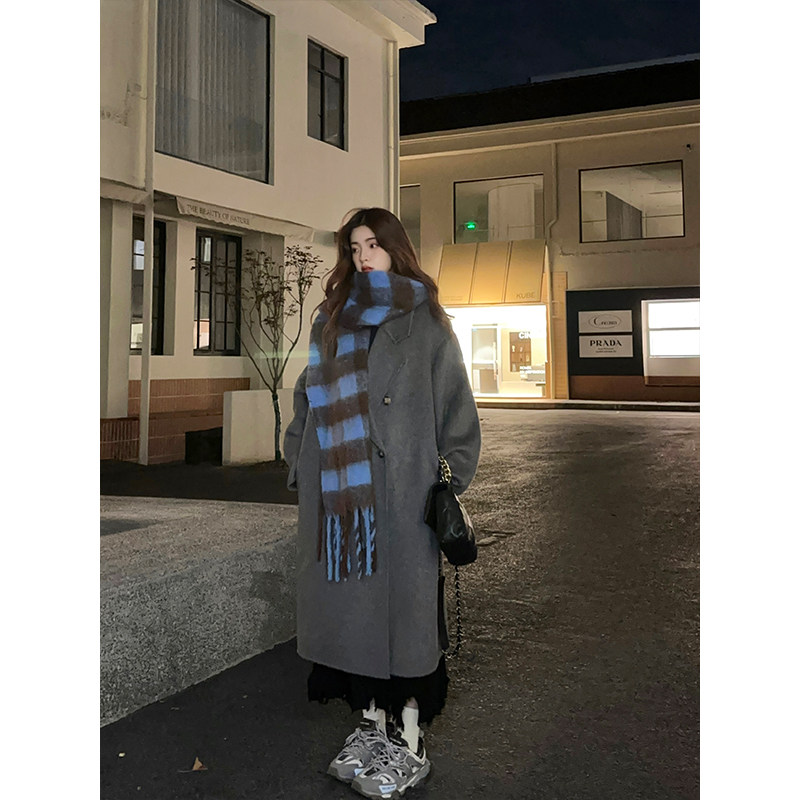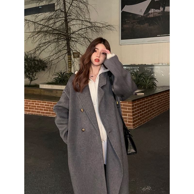 Adan手工灰色大衣女温柔系韩版宽松双排扣双面呢羊毛中长款外套