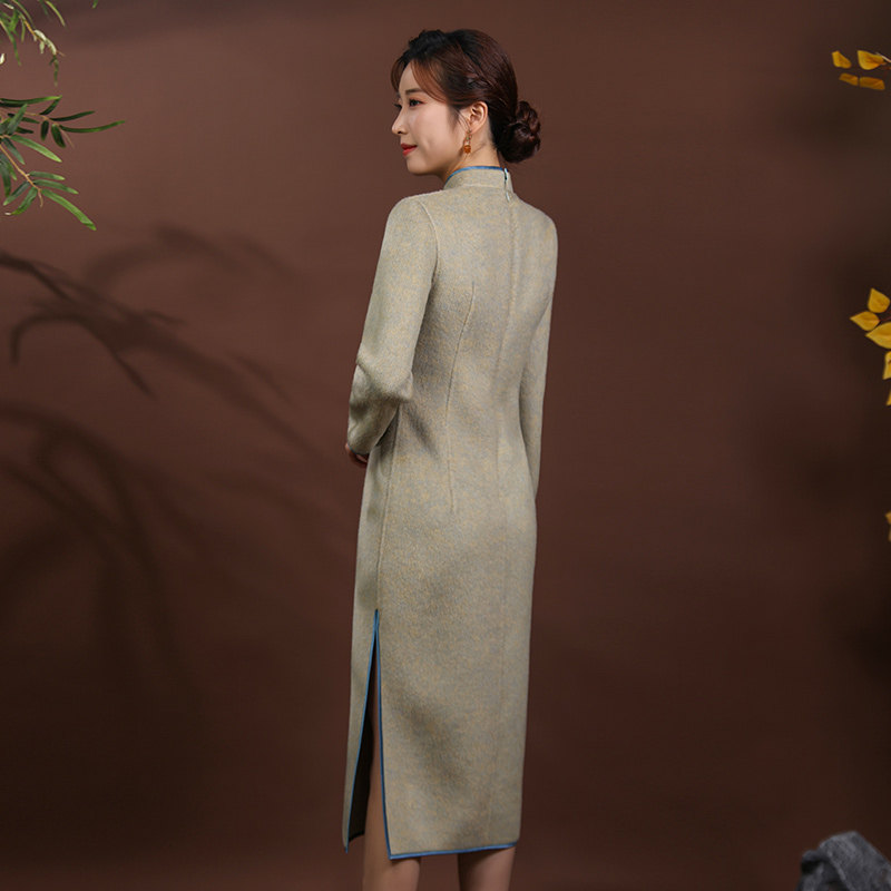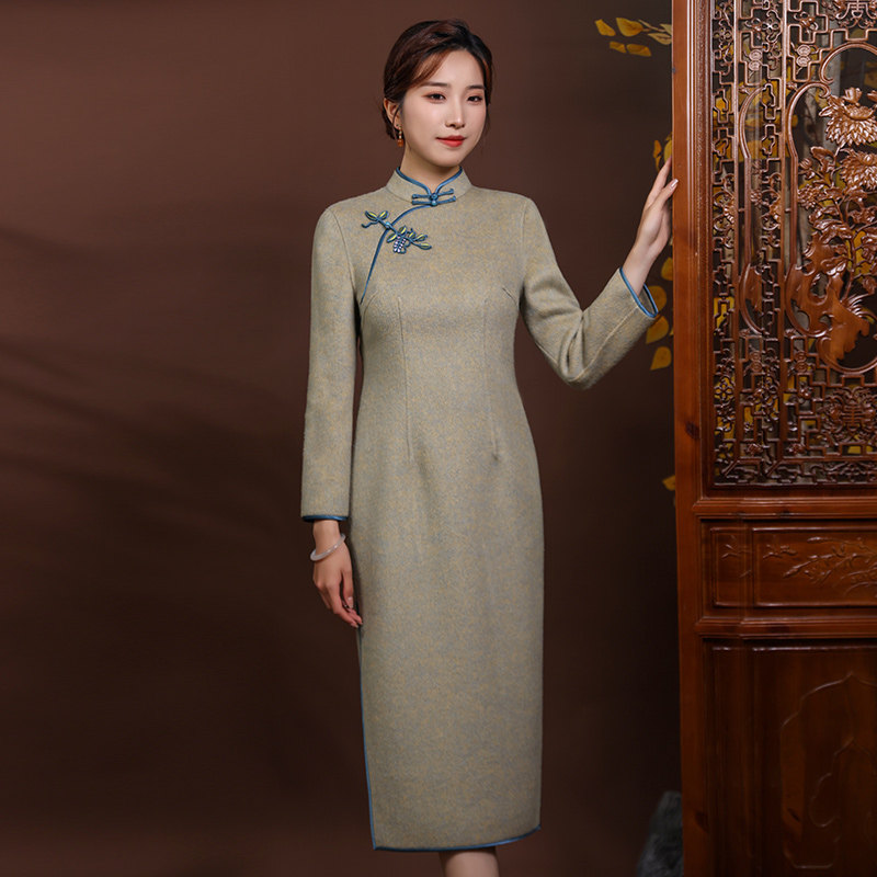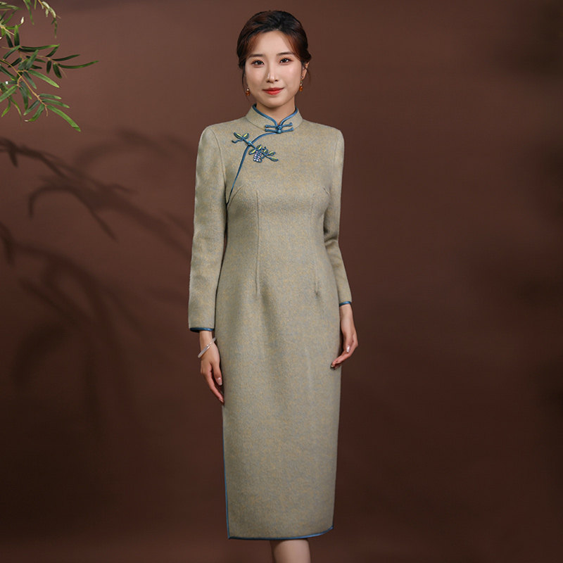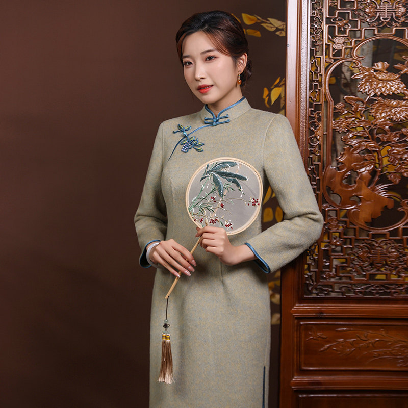 蝶恋秋冬复古羊毛呢旗袍裙中式修身撞色中长款崔万志旗袍连衣裙