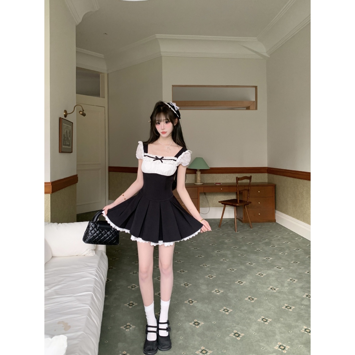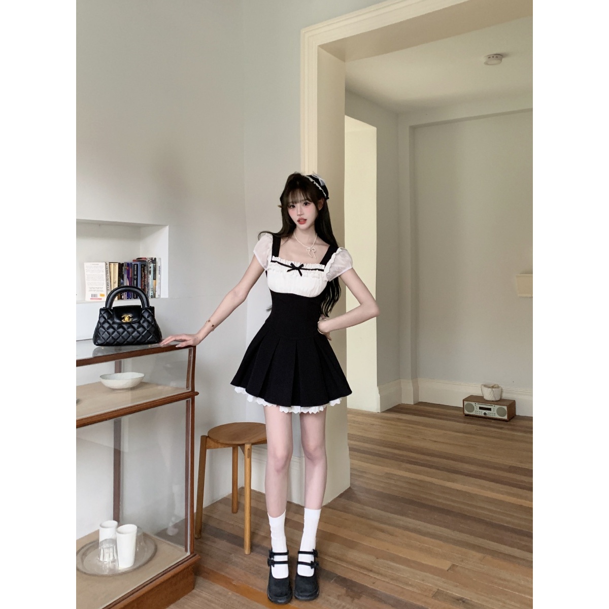 越韩小鱼 恋爱絮语 法式方领纯欲少女风黑白拼接百褶连衣裙女夏季
