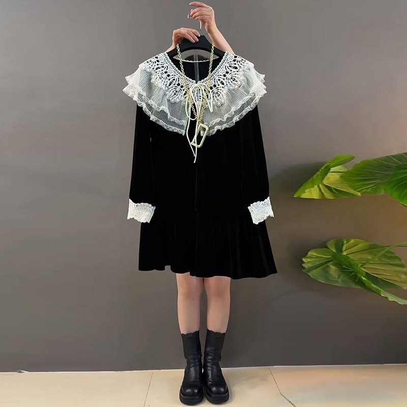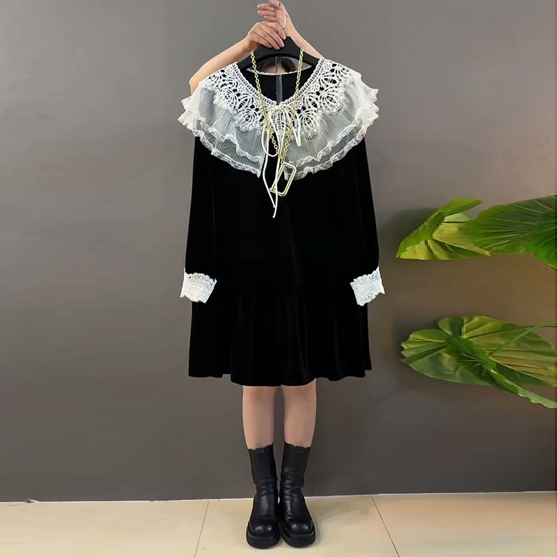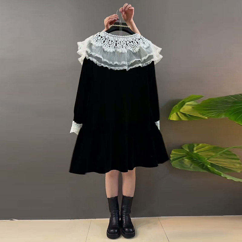 2026春季新款蕾丝领连衣裙胖mm显瘦拼接小黑裙中长丝绒裙大码女装