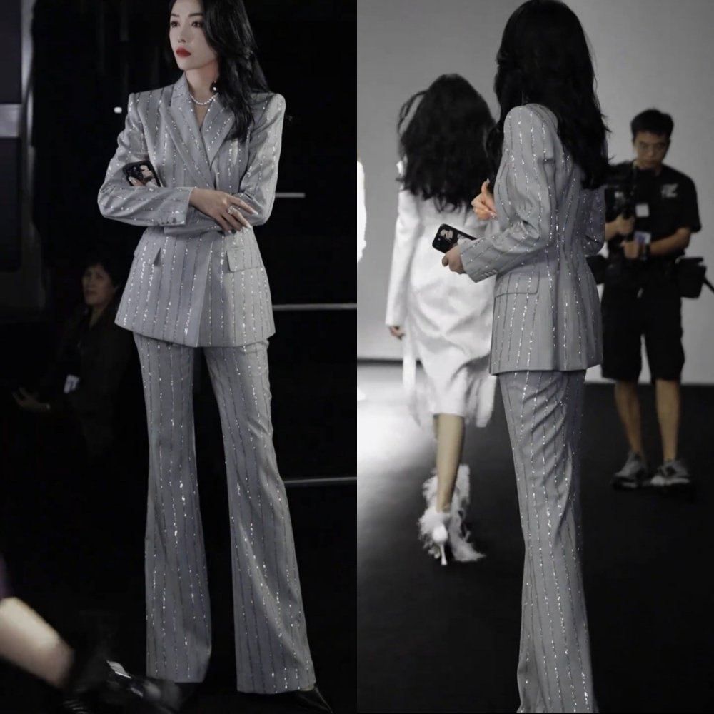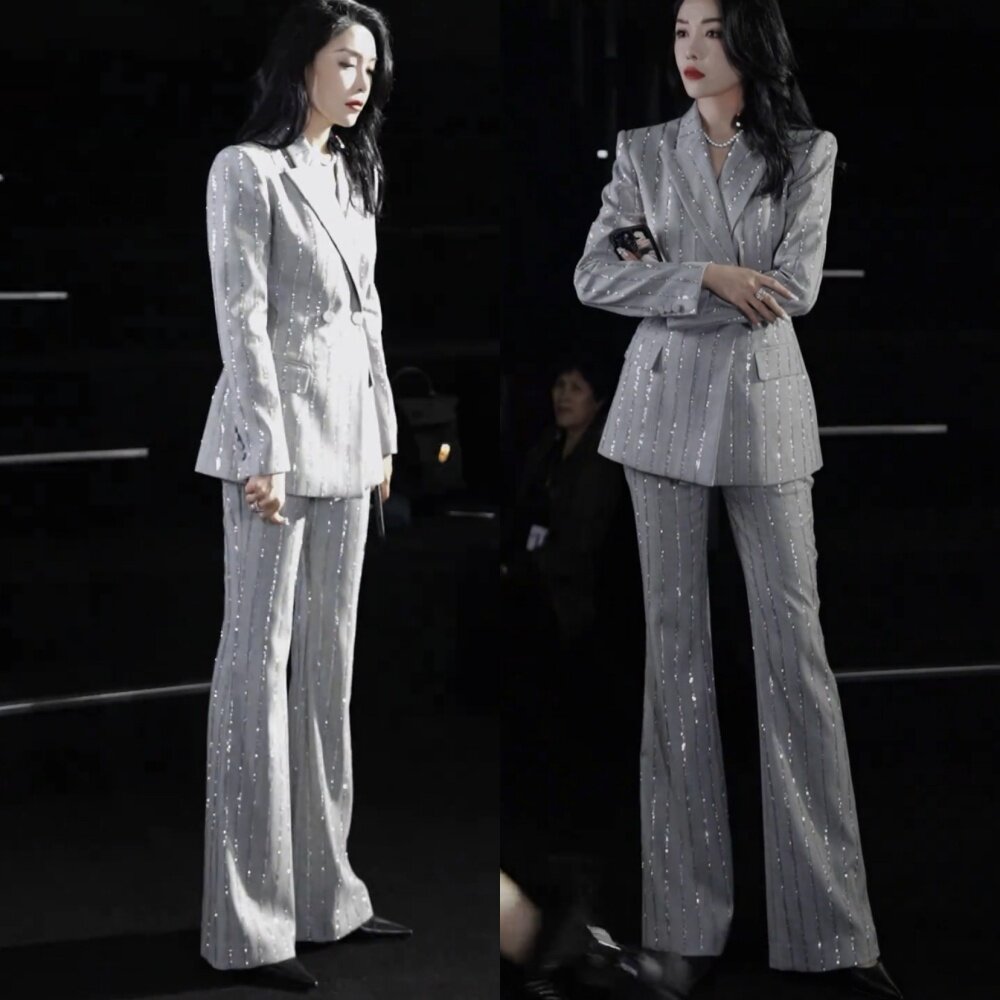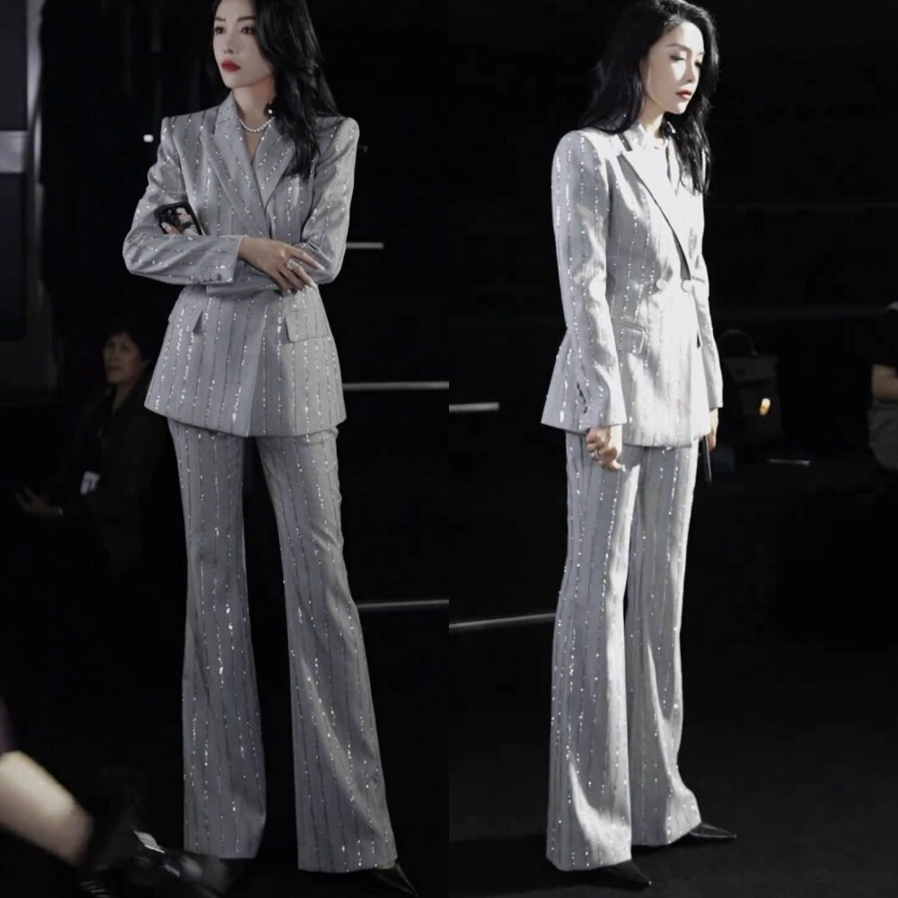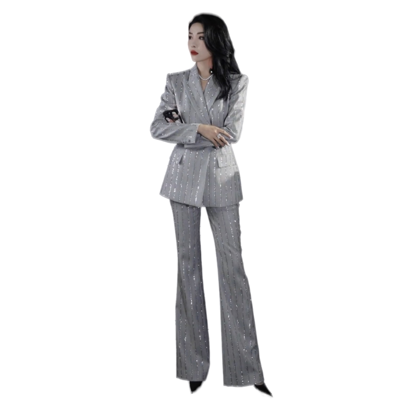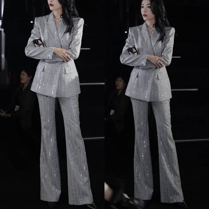珠片西装外套高腰长裤两件套装