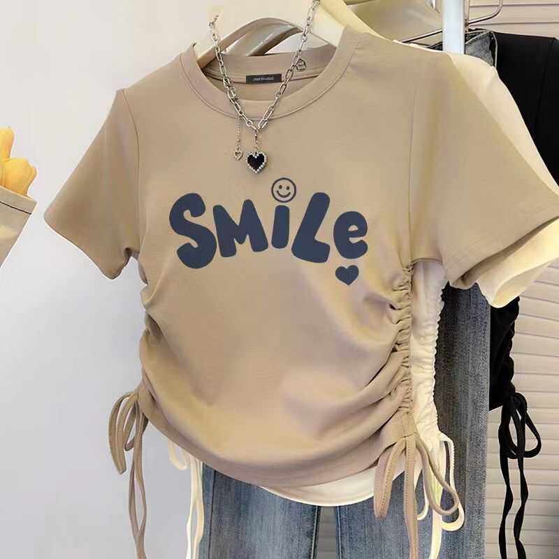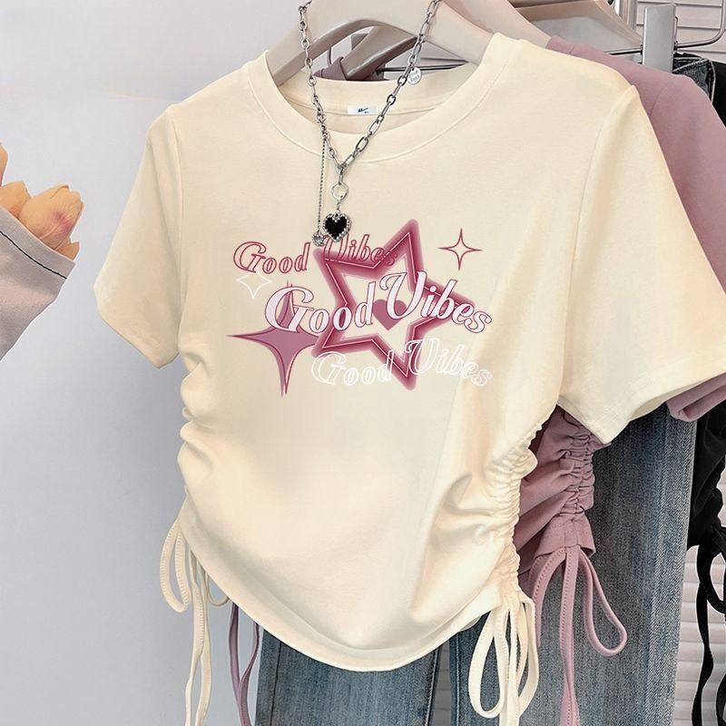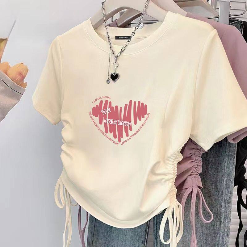 纯棉女中大童正肩短袖t恤夏季甜辣抽绳收腰夏装女童孩短款小上衣
