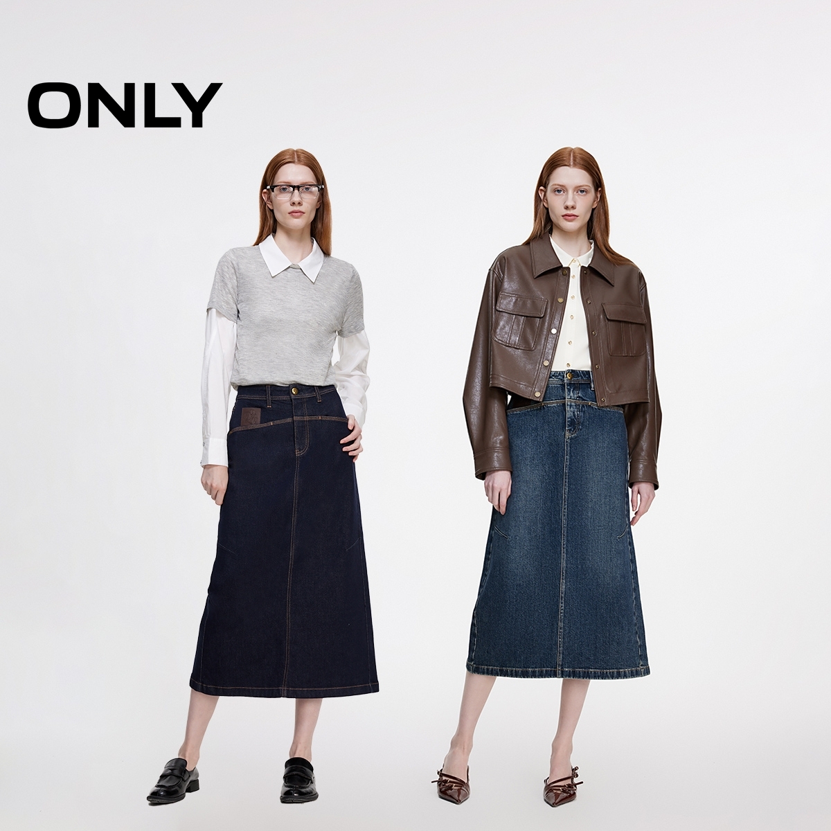 ONLY2025秋季新款通勤个性口袋复古开衩高腰A字伞裙牛仔半身裙女
