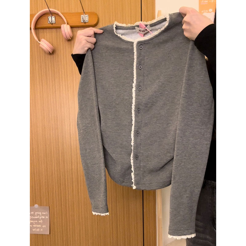 奶油的宇宙 拼接蕾丝加绒加厚内搭开衫长袖女ins温柔风打底衫上衣