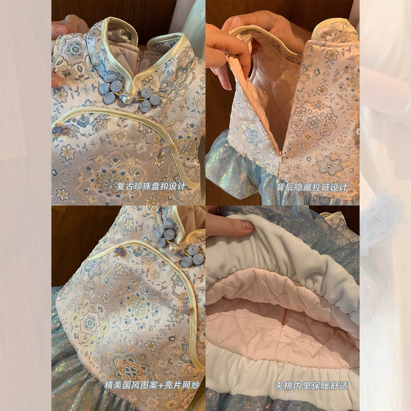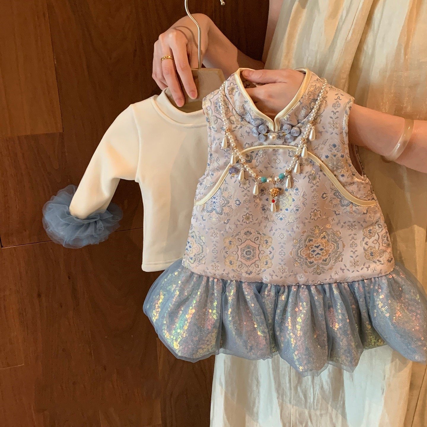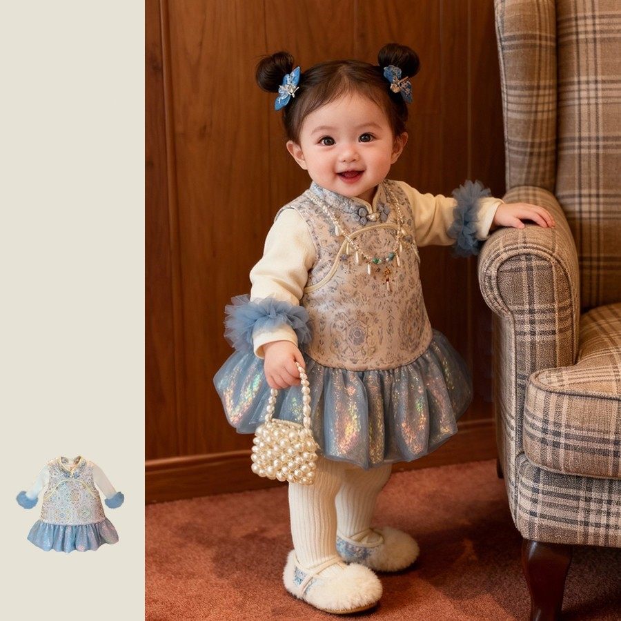 女童国风夹棉连衣裙洋气冬装周岁礼服2025新款小童女宝宝两件套潮