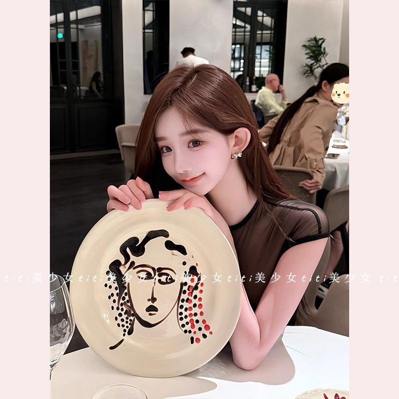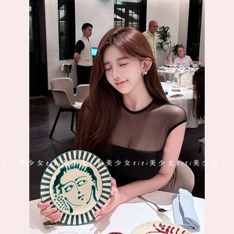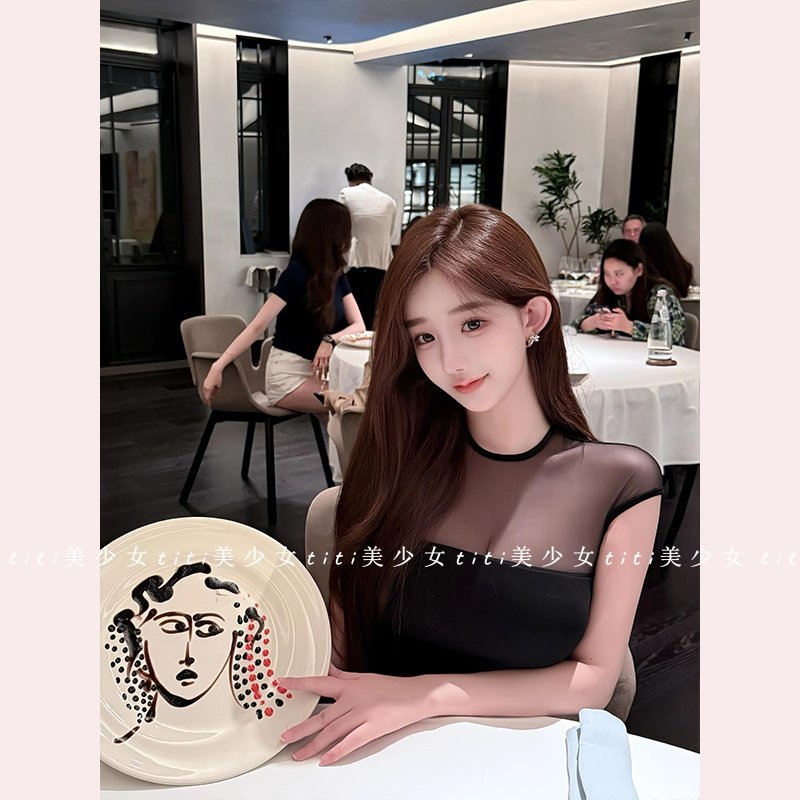 【TiTi美少女】纯欲风短袖t恤女秋拼接修身掐腰网纱微透黑色上衣