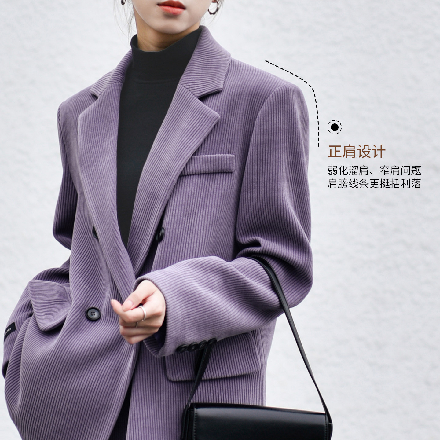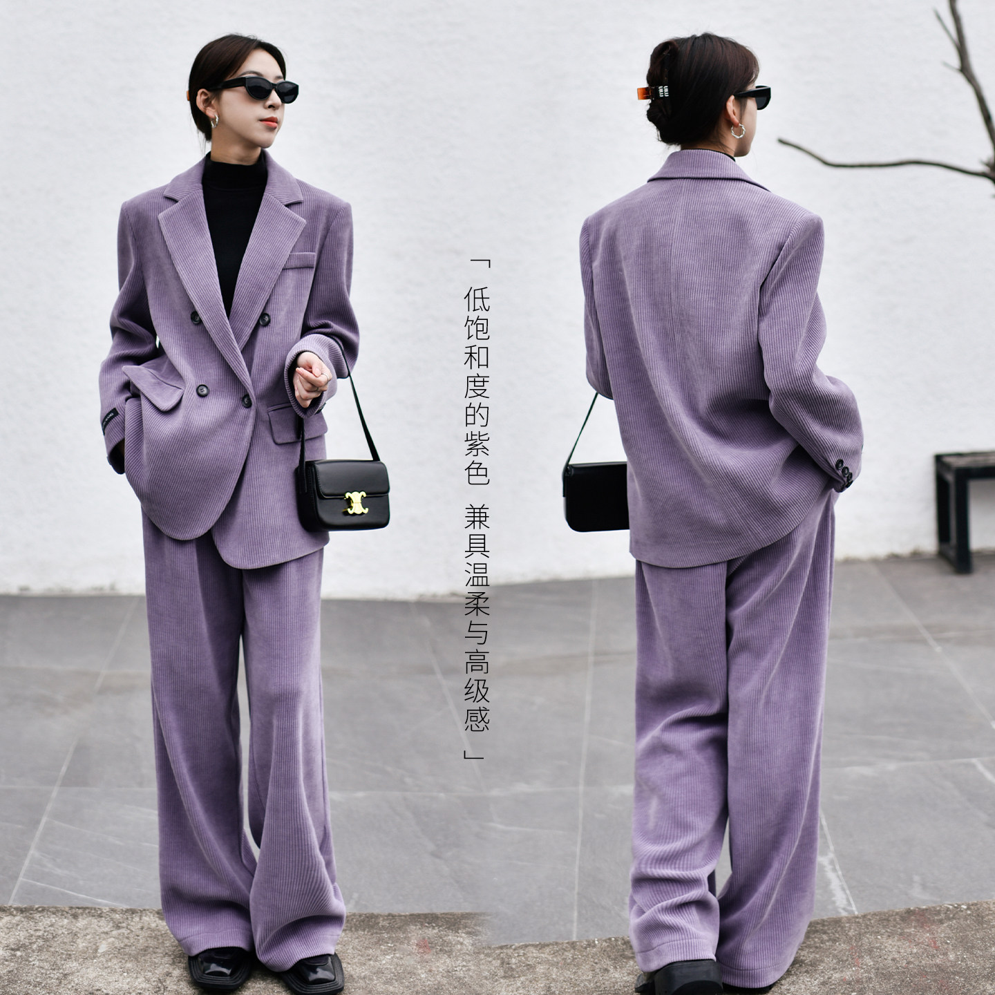 灯芯绒西装套装女冬保暖复古职场高级感紫色西服外套直筒裤两件套