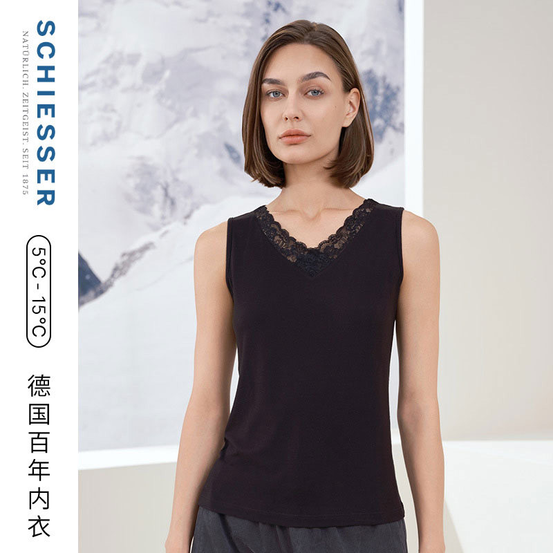 SCHIESSER舒雅女士吸湿速干双面磨毛蕾丝花边V领纯色保暖背心