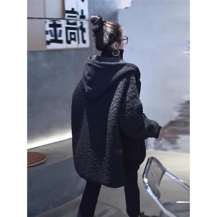 胖mm大码女装黑色羊羔毛棉衣女冬季高级感韩版保暖棉袄棉服外套潮