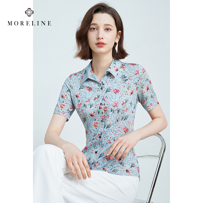 沐兰商场同款高级感印花翻领衬衫女2025年夏新款修身显瘦短袖衬衣