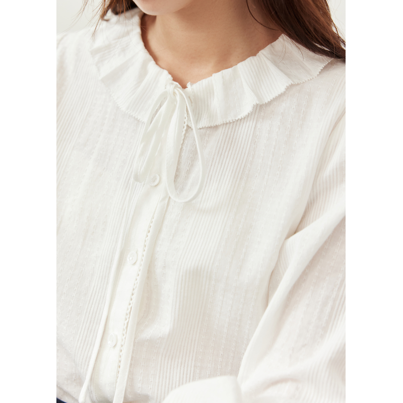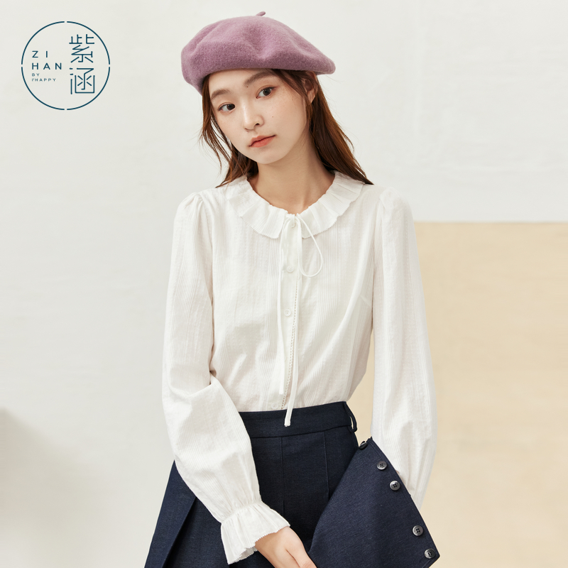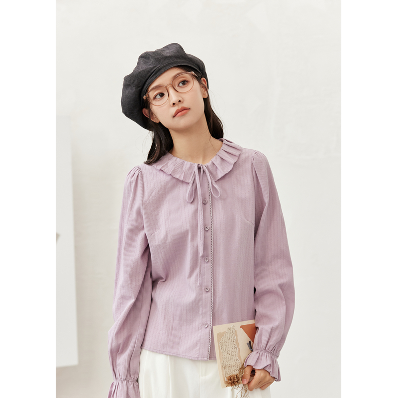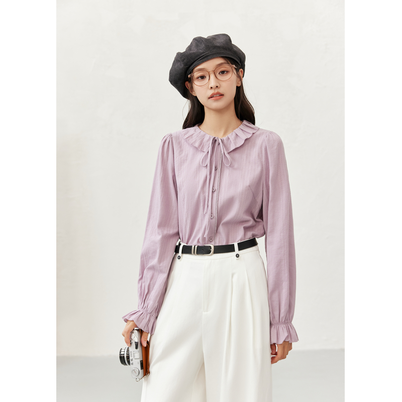紫涵娃娃领系绳长袖衬衫女2025年秋季新款文艺感甜美宽松显瘦衬衣