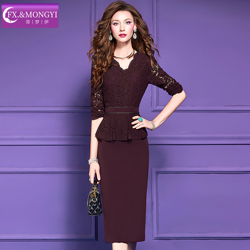 菲梦伊蕾丝连衣裙女长袖秋装新款复古轻熟荷叶边收腰假两件包臀裙