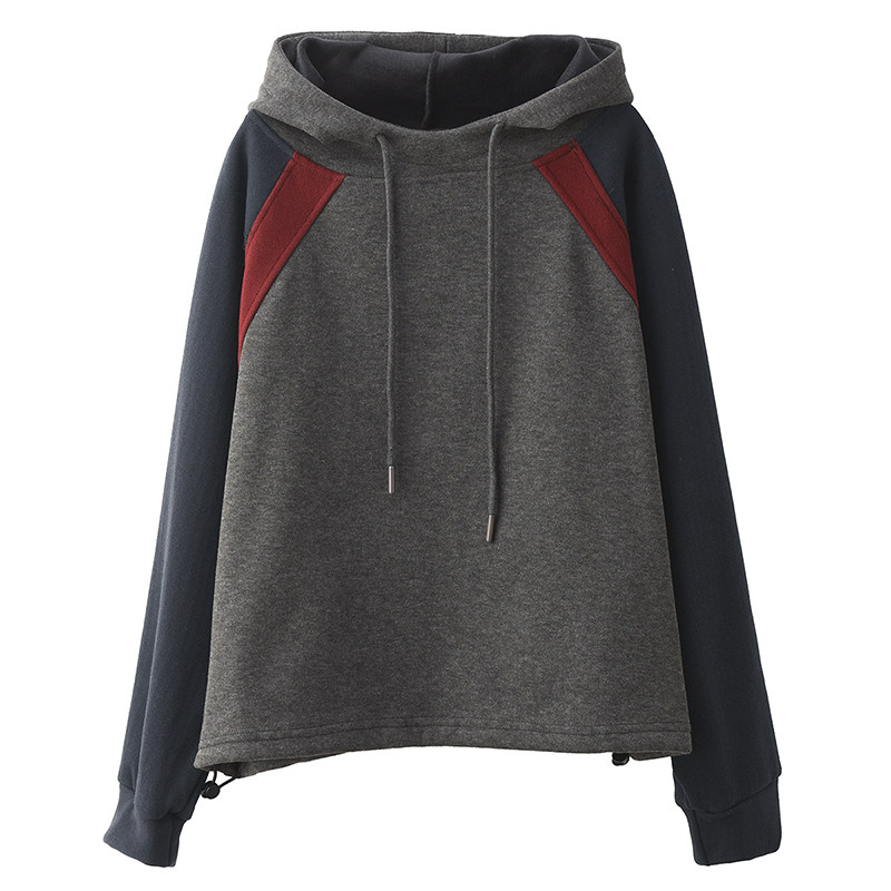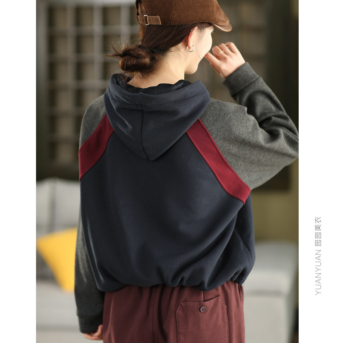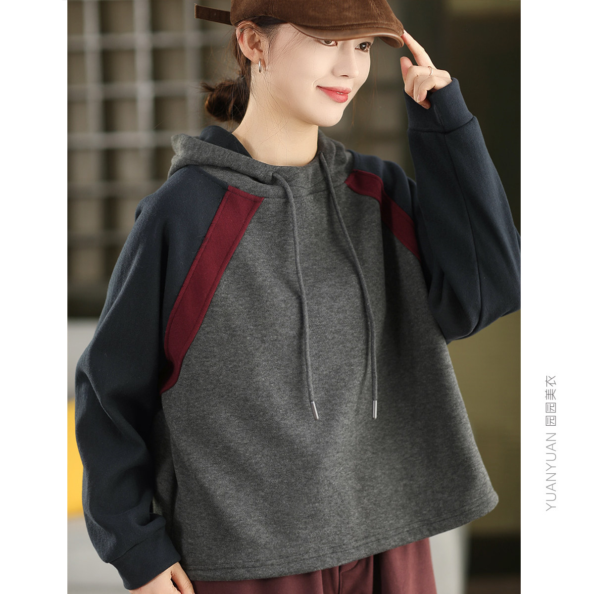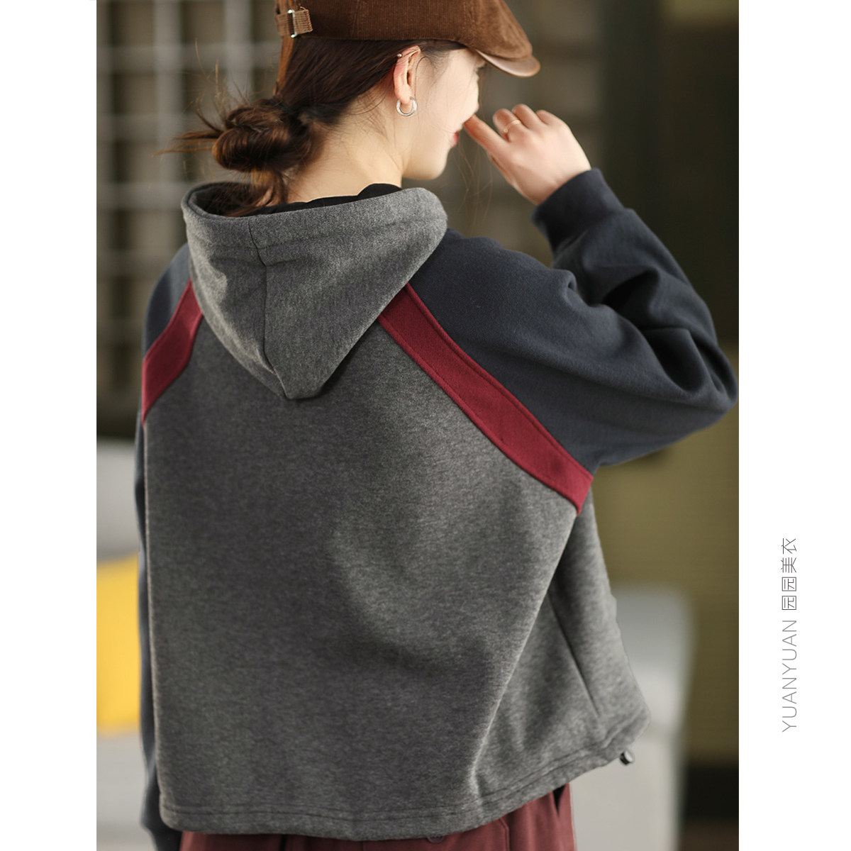 园园美衣复古拼色针织棉加绒连帽卫衣女冬季加厚套头帽衫保暖绒衫