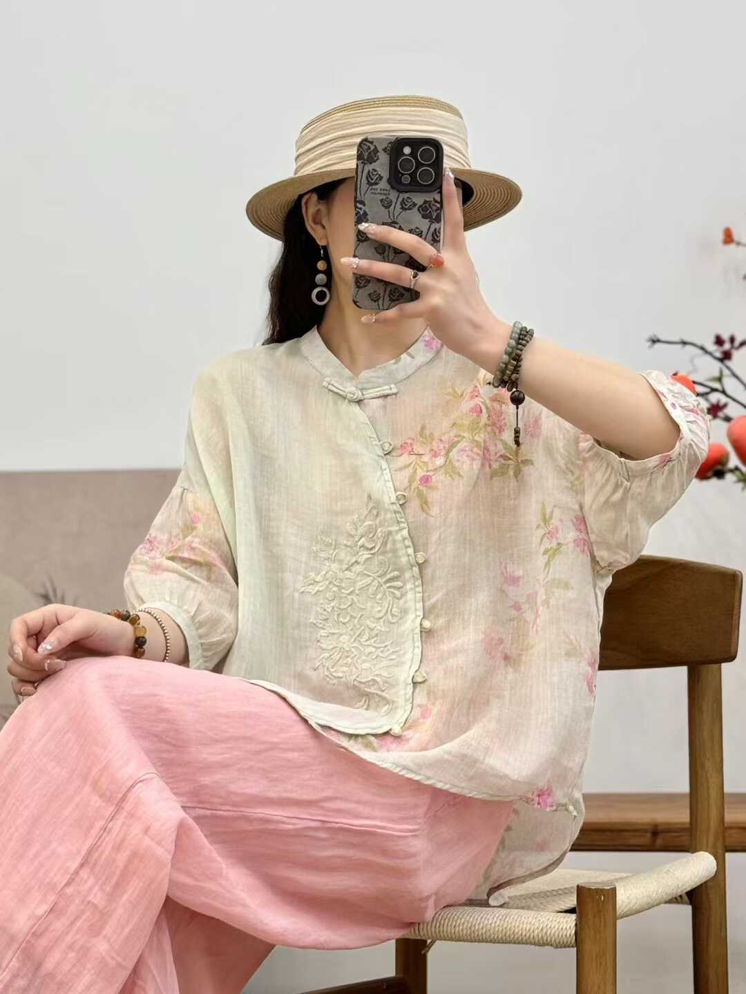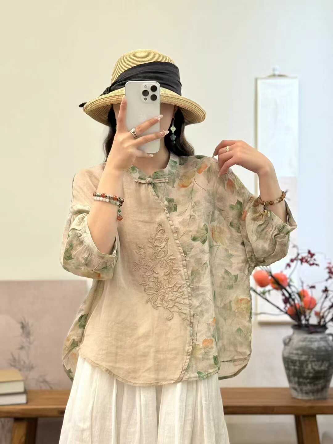 苎麻衬衣气质女士碎花简约宽松
