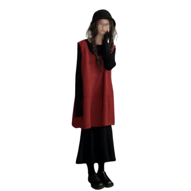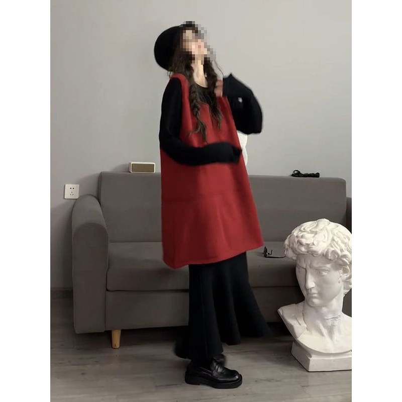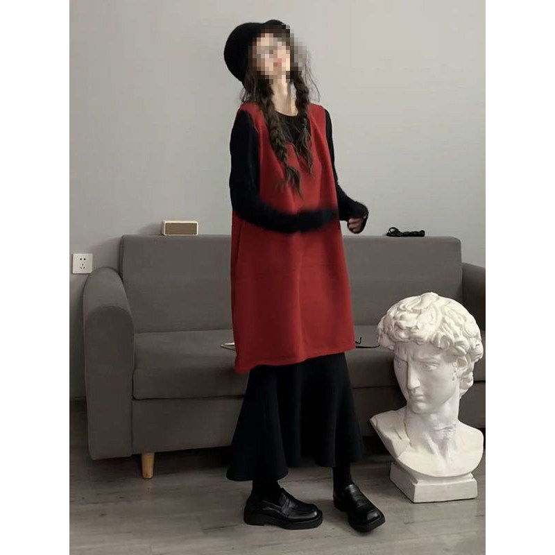 韩版复古文艺温柔红色无袖背心毛衣裙搭配黑色长袖打底衫两件套装