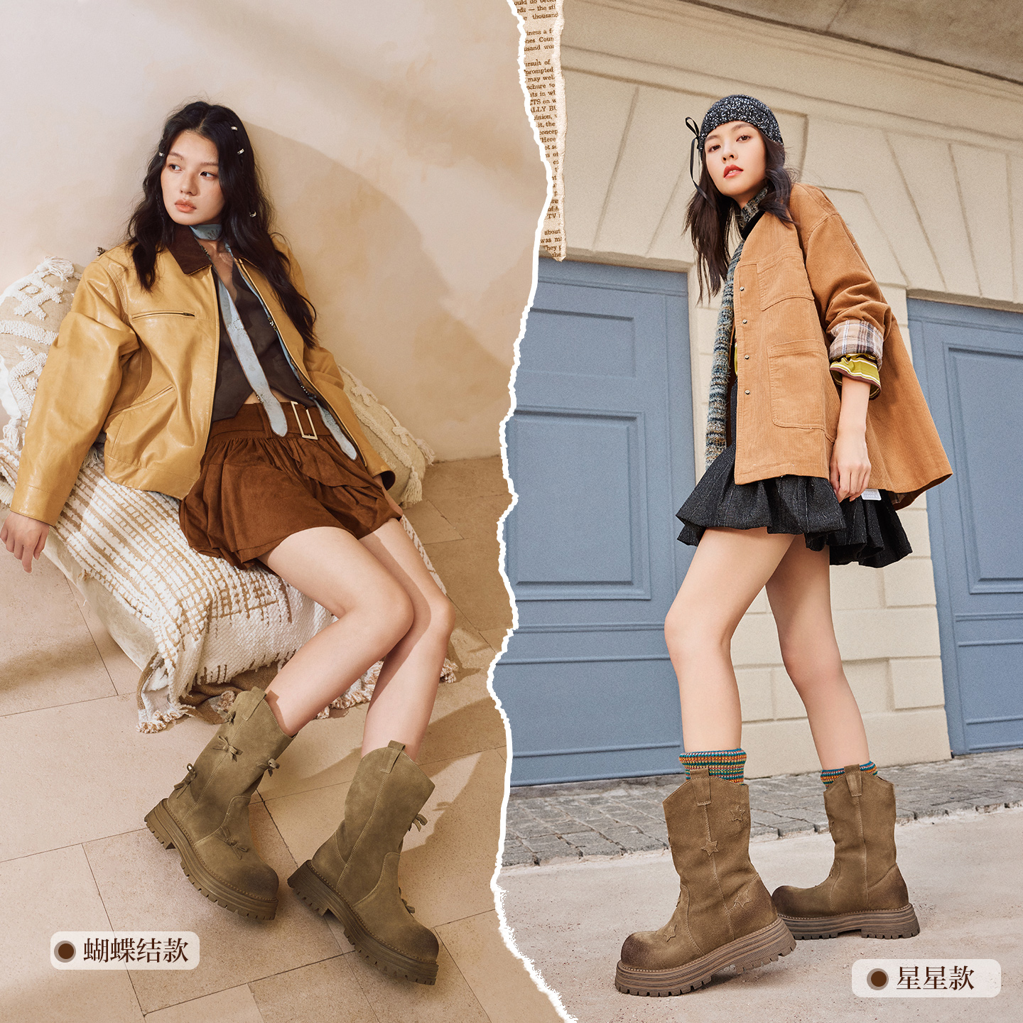 天美意复古V口厚底西部靴加绒星星堆堆靴女鞋子冬新款骑士靴短靴