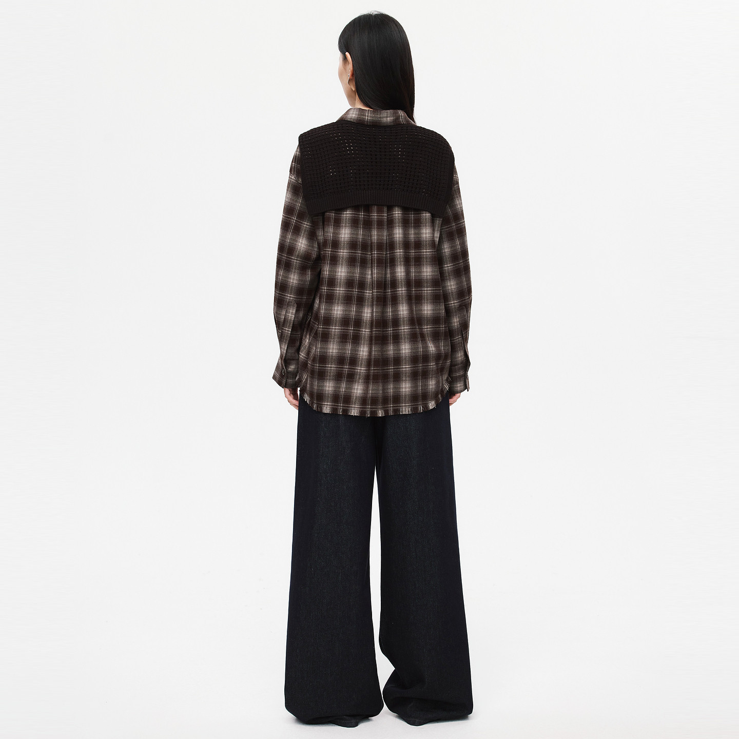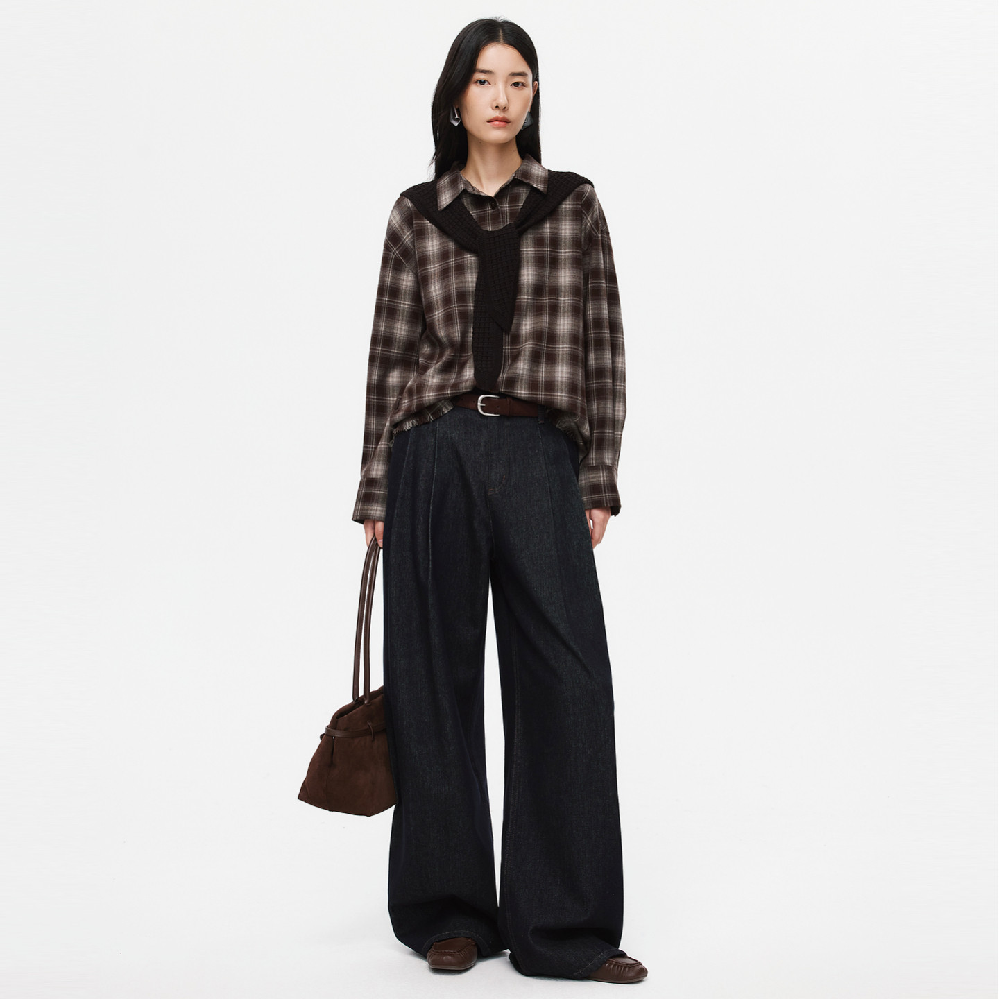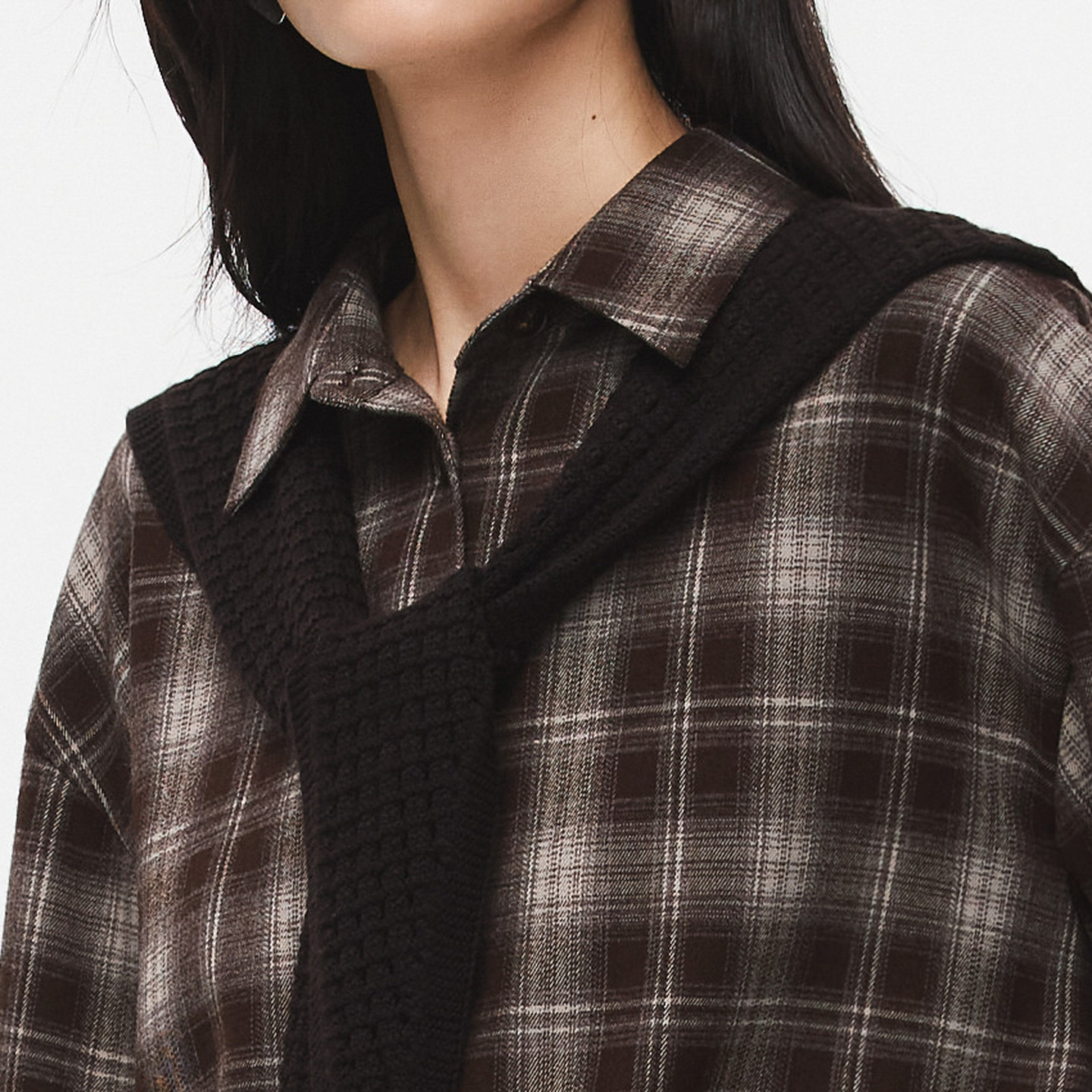 水云间女装 通勤简约翻领时尚宽松格纹长袖衬衫附披肩26春季新款
