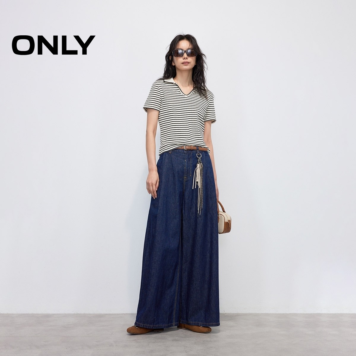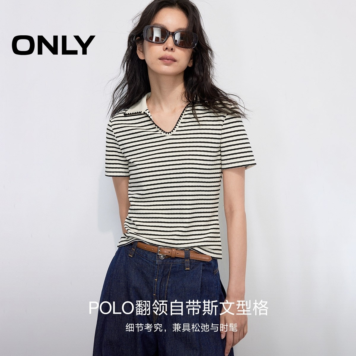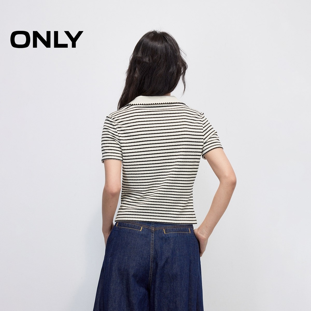 ONLY2025夏季新款柔软舒适经典条纹刺绣polo领修身正肩短袖T恤女