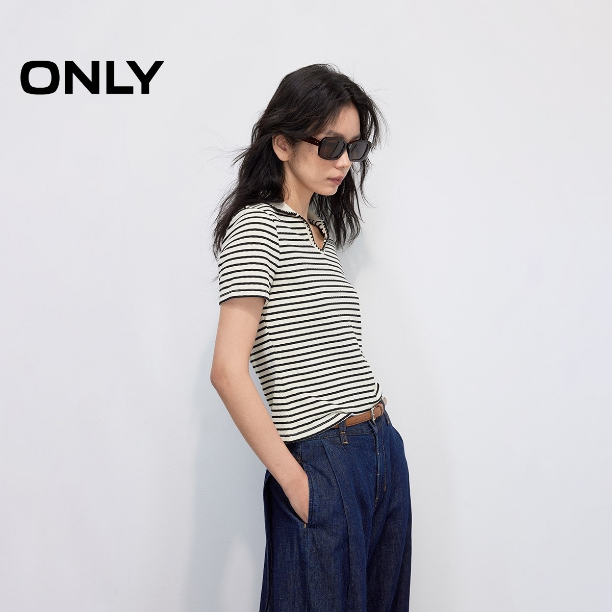 ONLY条纹正肩polo领T恤