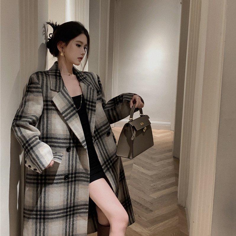 实拍复古格子英伦风长款加棉毛呢大衣外套女