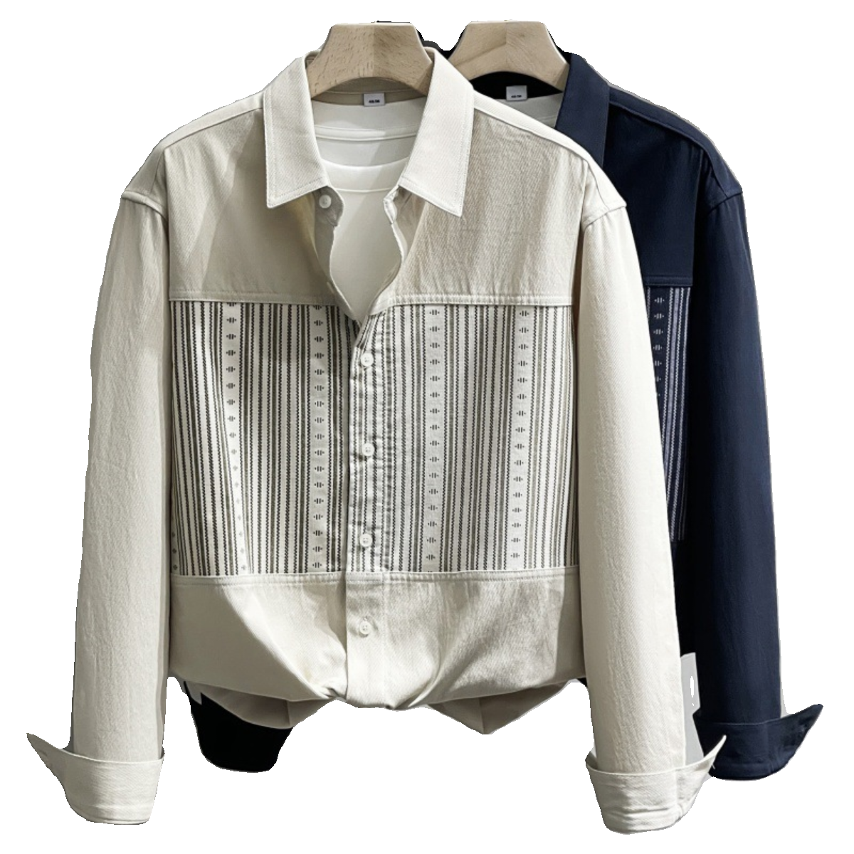 2023年条纹撞色拼接长袖衬衫男春秋韩版轻熟风纯棉宽松休闲衬衣潮
