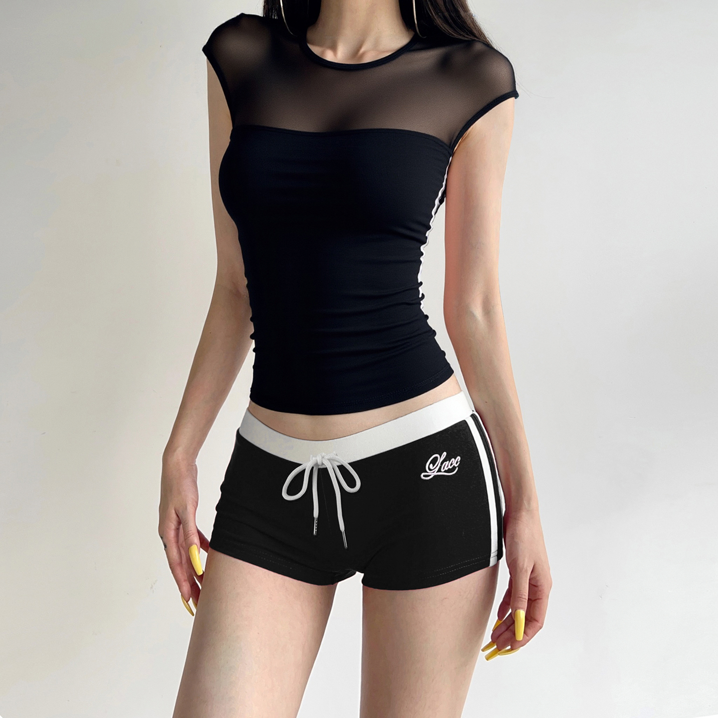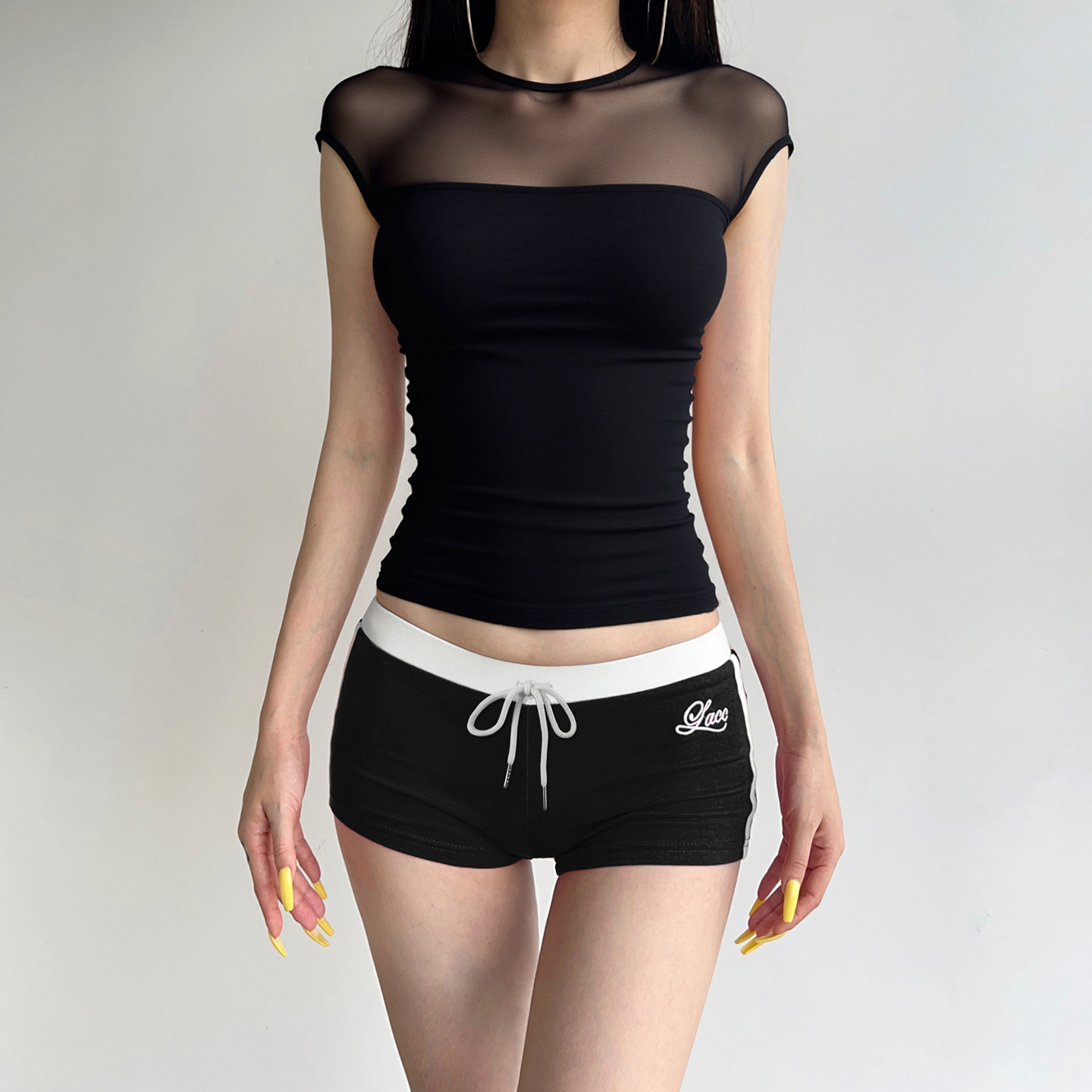 H家欧美女装 禁欲性感透视网纱拼接短袖T恤紧身heels辣妹黑色上衣