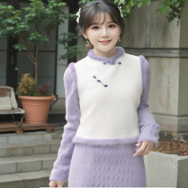 复古轻国风大码女冬胖mm新中式绒毛蕾丝旗袍连衣裙两件套时尚套装