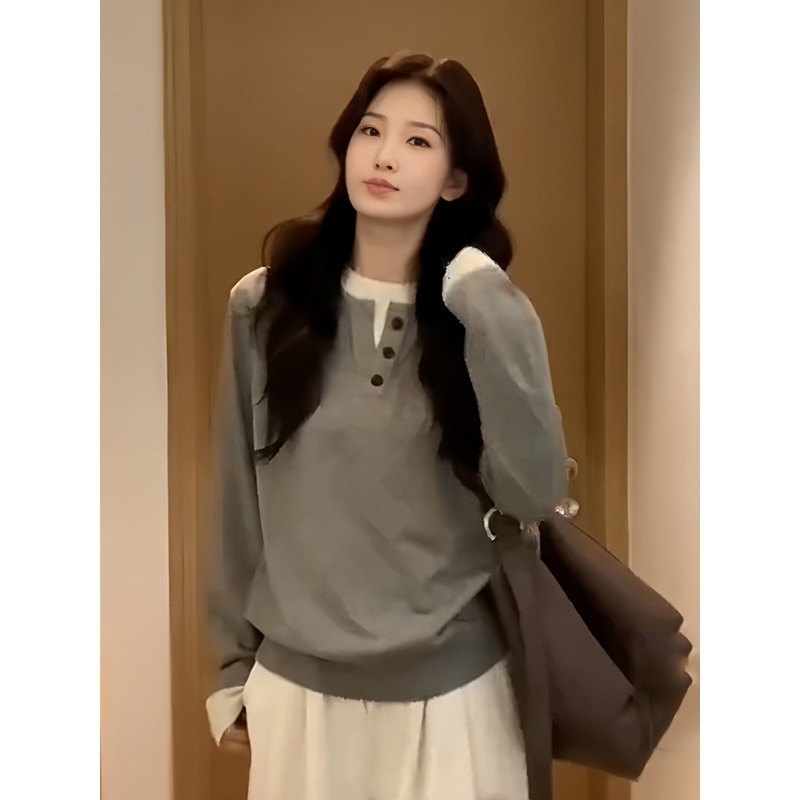 大码韩系假两件显瘦气质长袖T恤2025秋季胖mm时尚宽松打底衫上衣