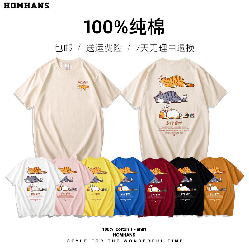趣味卡通猫咪印花短袖潮流夏装T恤重磅纯棉舒适男女学生情侣宽松