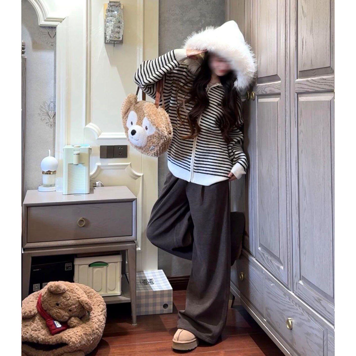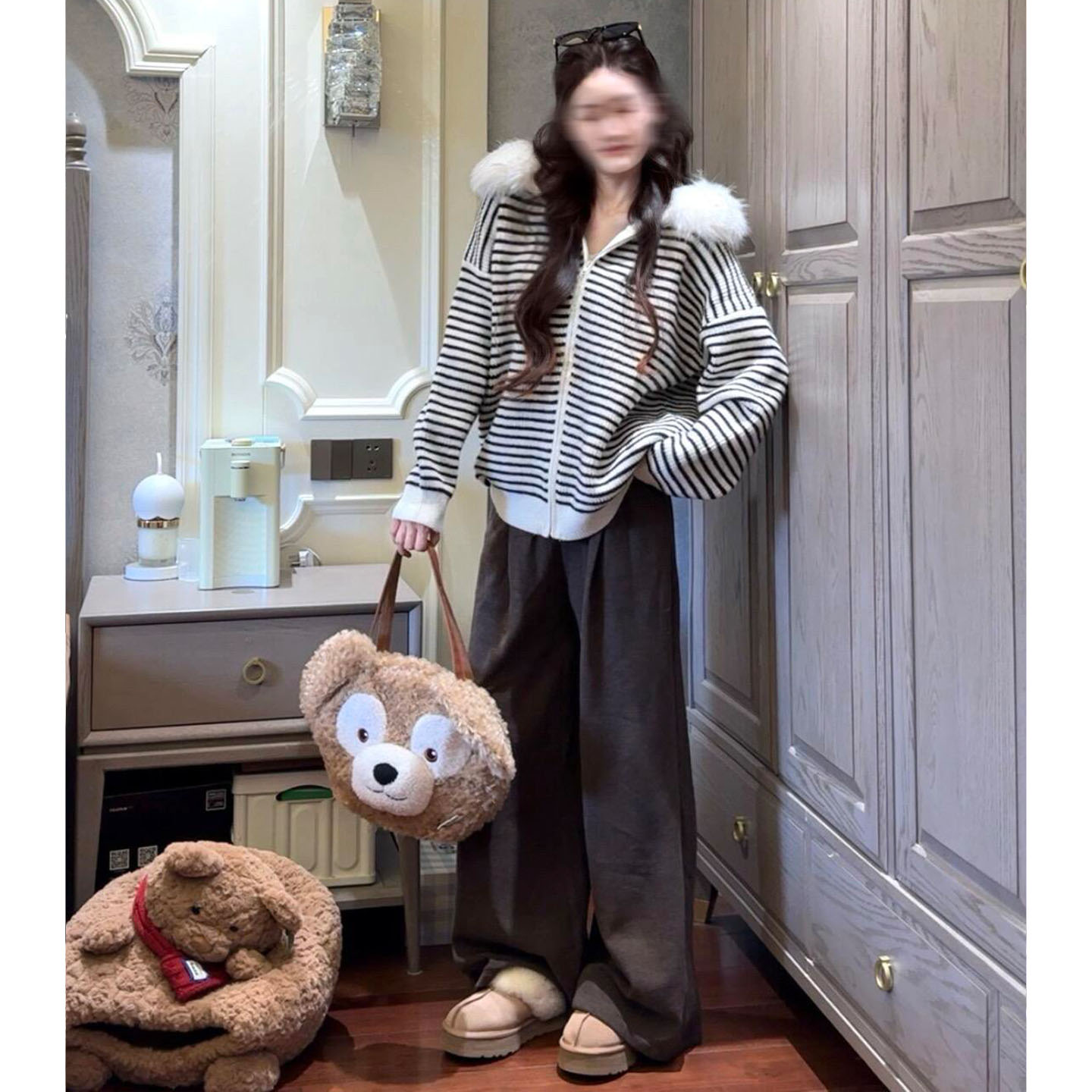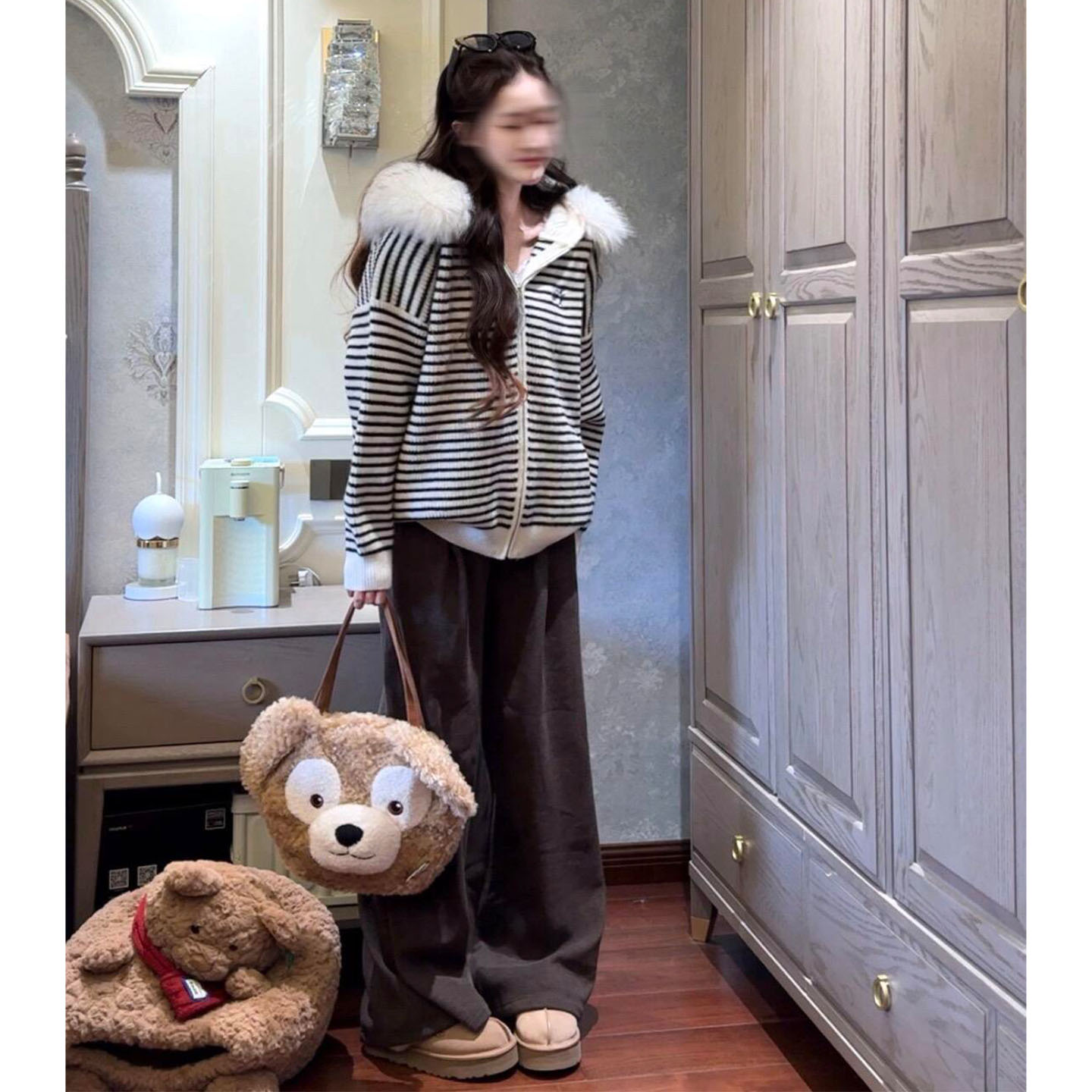 秋冬洋气减龄软糯条纹连帽毛领毛衣休闲裤子慵懒松弛感两件套装女