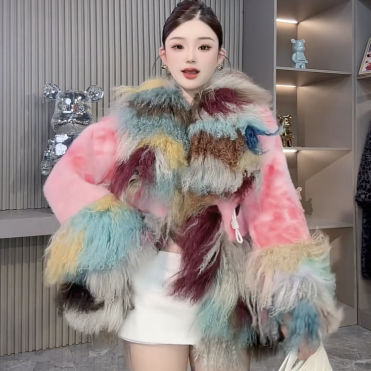 欧货走秀款冬季新欧貂绒皮毛一体外套女中长款仿貂拼真羊羔毛皮草