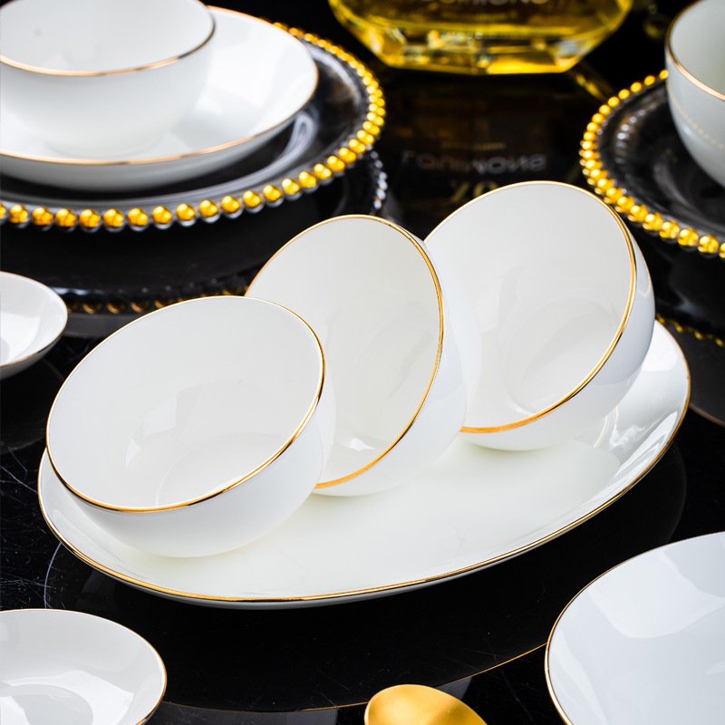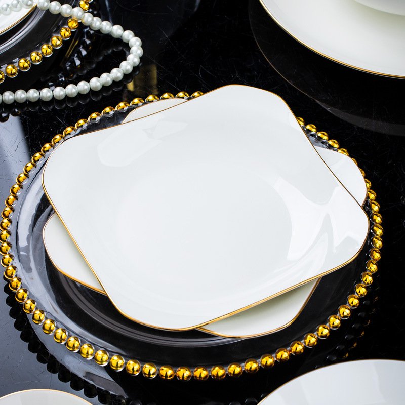 景德镇陶瓷餐具碗碟套装家用简约风纯白色描金边方盘骨瓷餐具套装