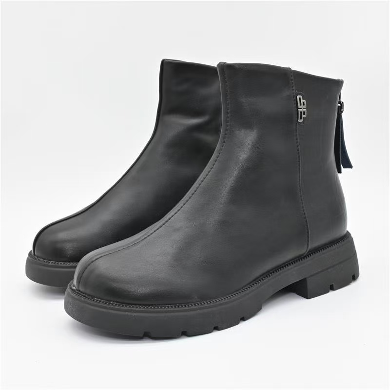 大东时装靴女2024冬季新款休闲风中跟粗跟圆头后拉链加绒短靴棉鞋