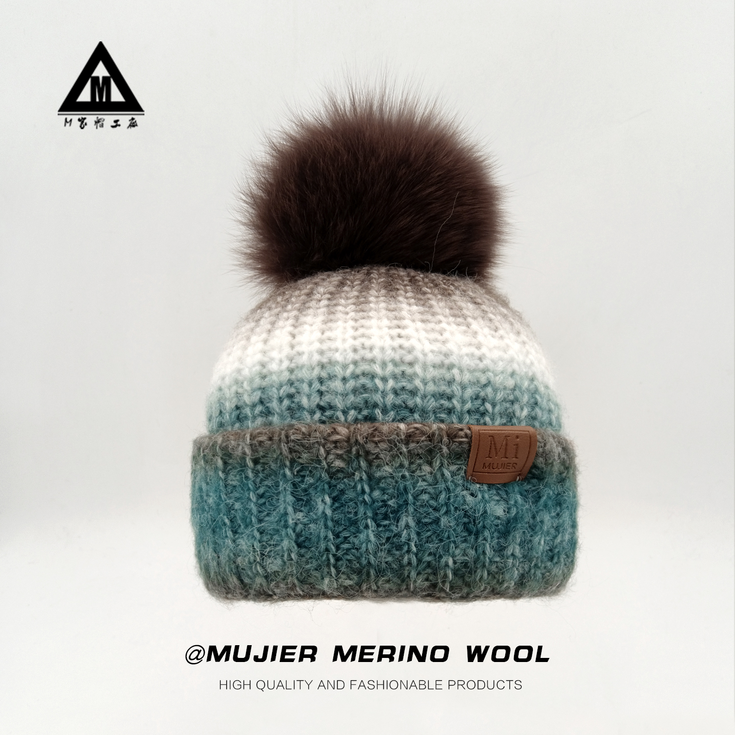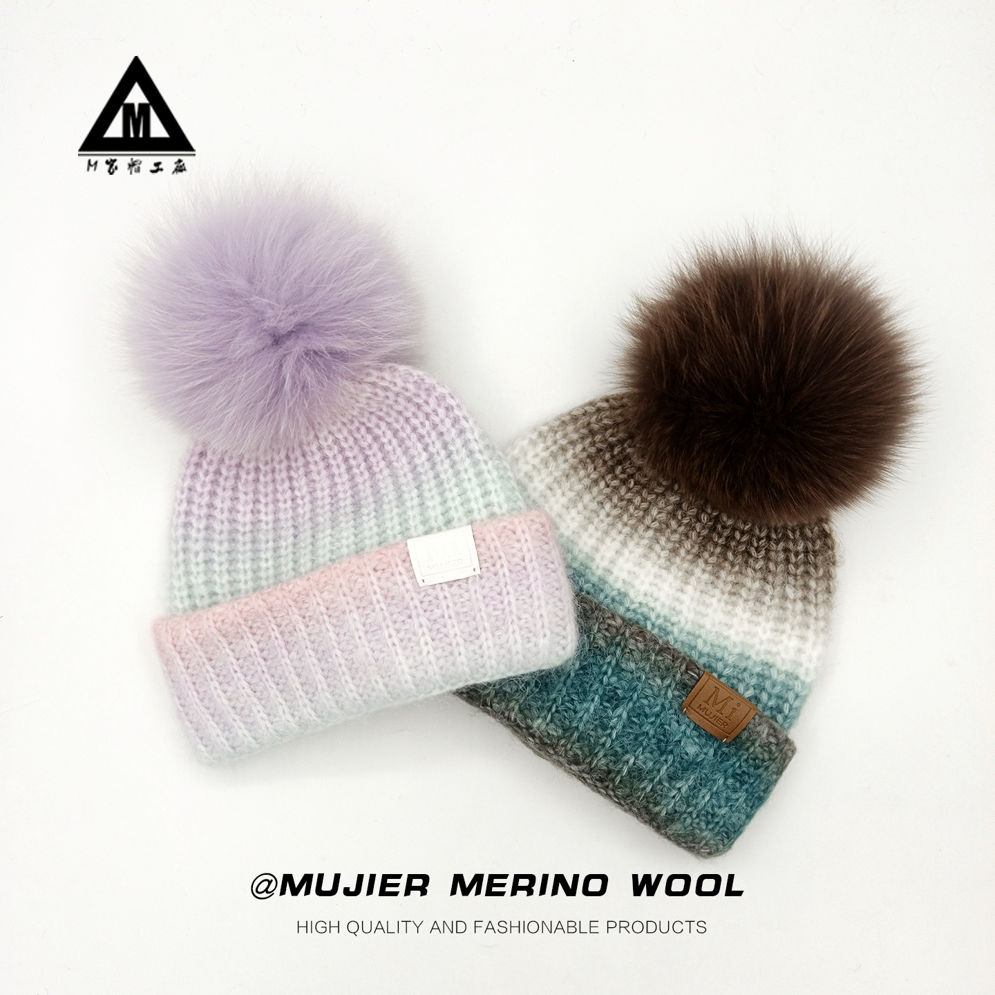 冰岛儿童扎染渐变色针织帽子秋冬男女宝宝保暖护耳狐狸毛球毛线帽