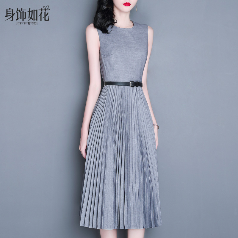 百褶连衣裙2025春秋新款夏淑女气质修身A字无袖中长款灰色背心裙