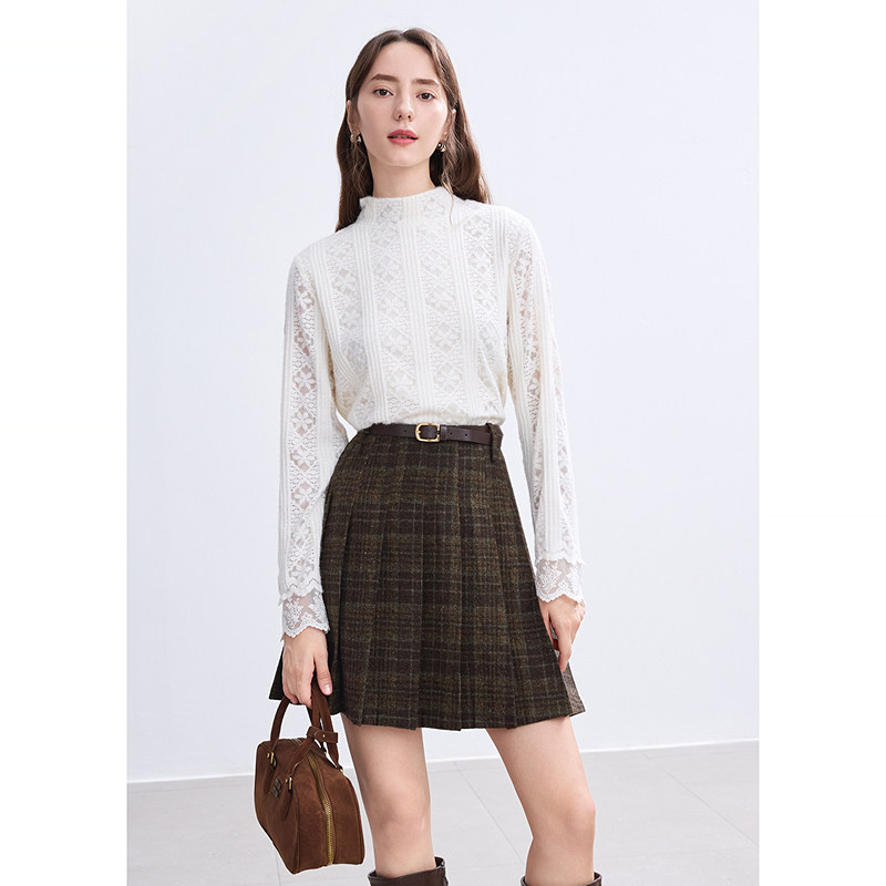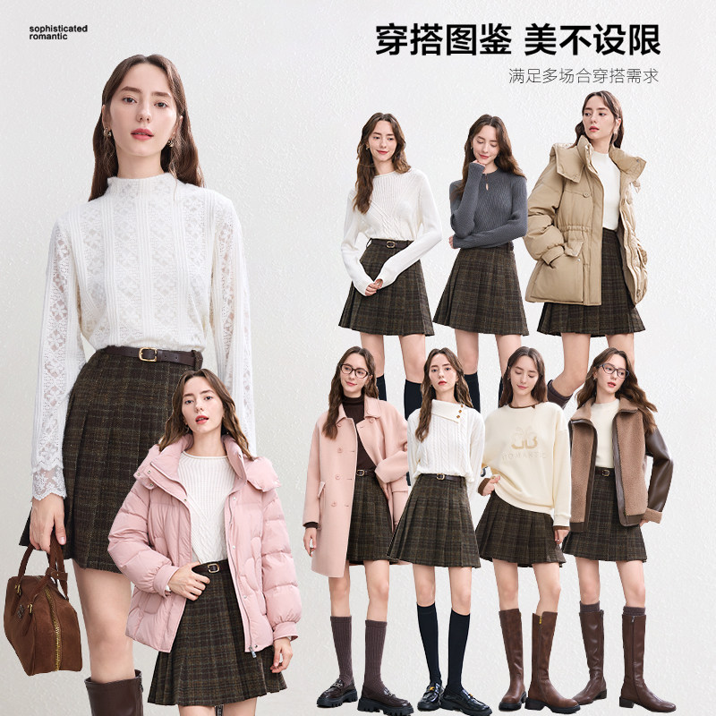 betu百图高腰毛呢半身裙女格子短裙2025年冬季新款百褶裙A字裙