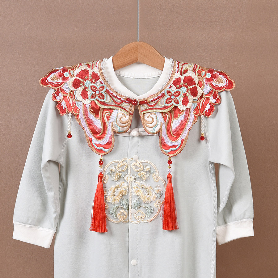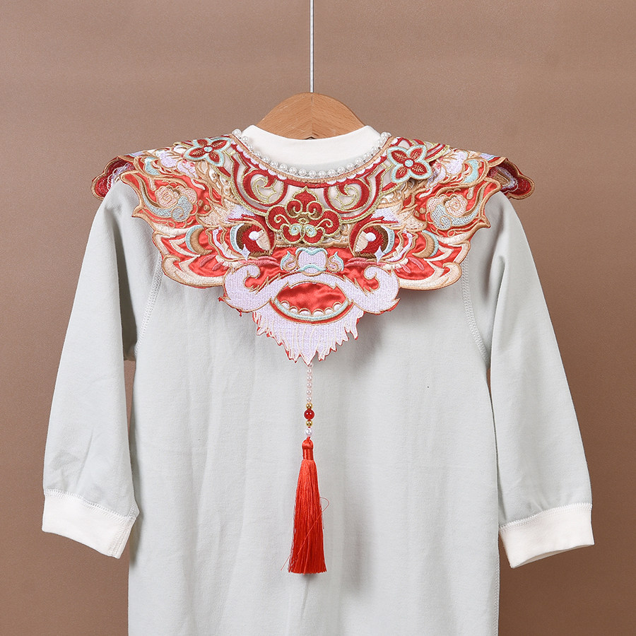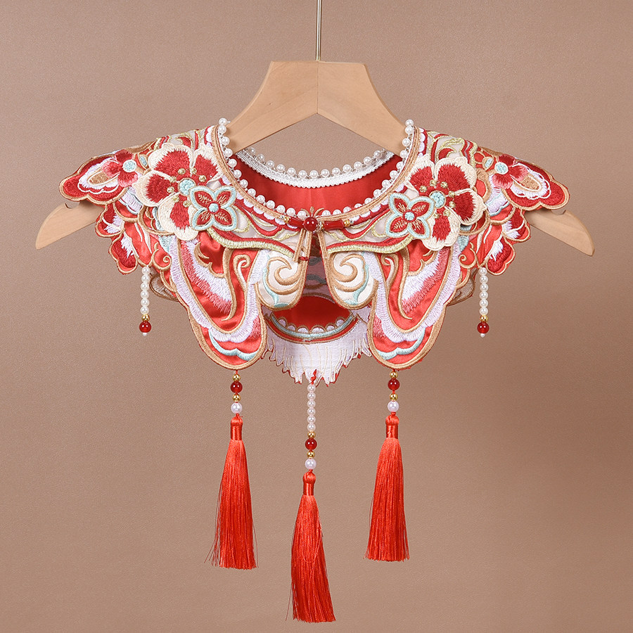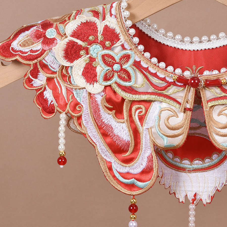 婴幼儿童周岁生日喜庆狮子刺绣古风汉服云肩红色富贵璎珞过年假领
