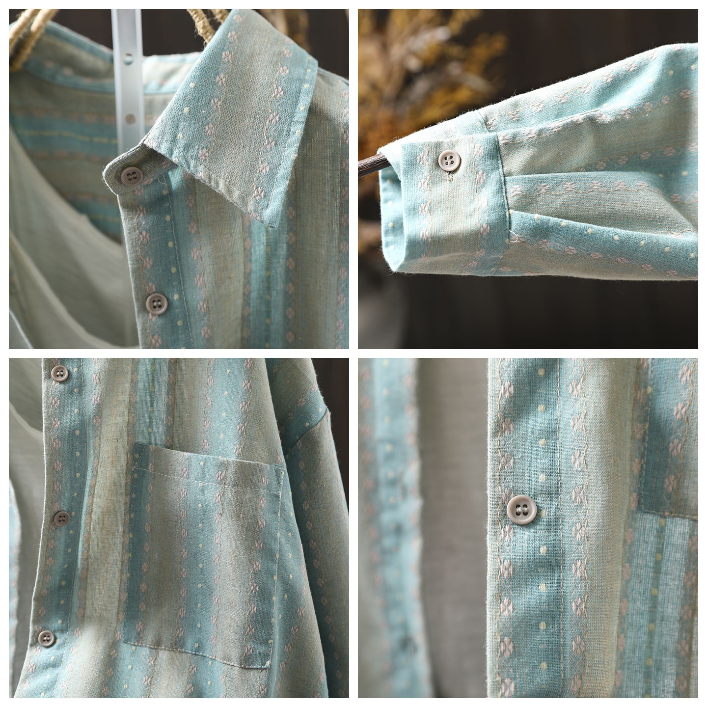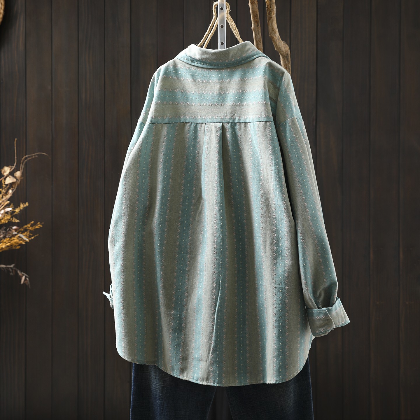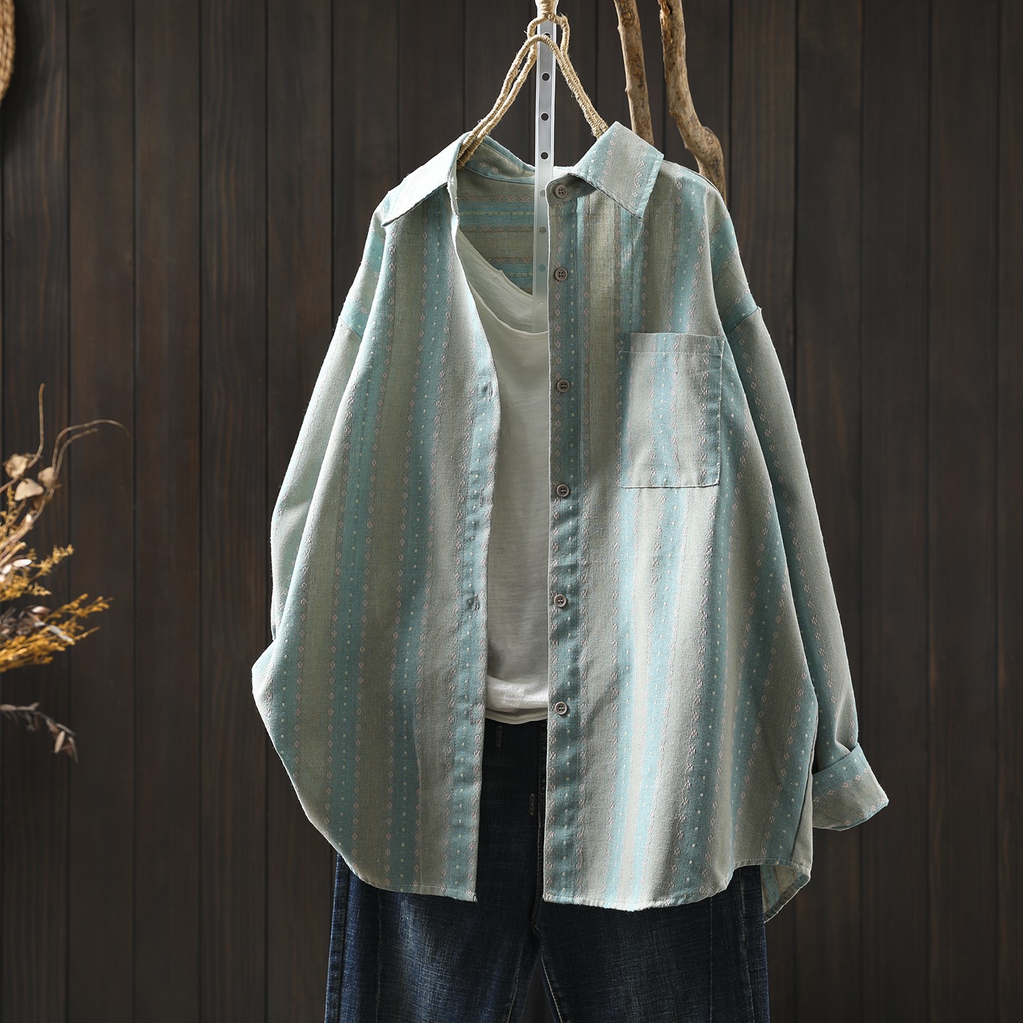 咖啡色纯棉提花条纹衬衫外套女长袖宽松2025新款复古休闲衬衣开衫