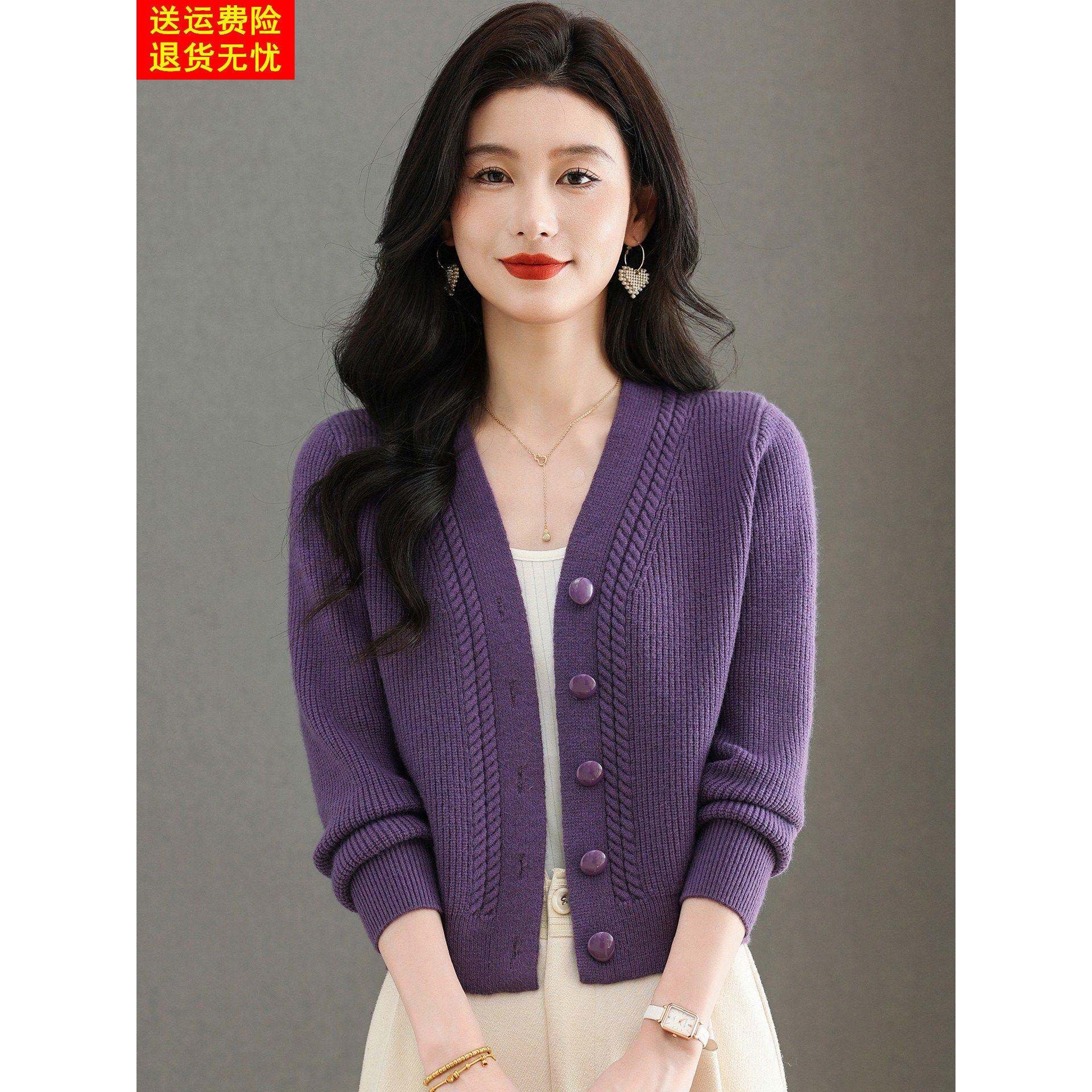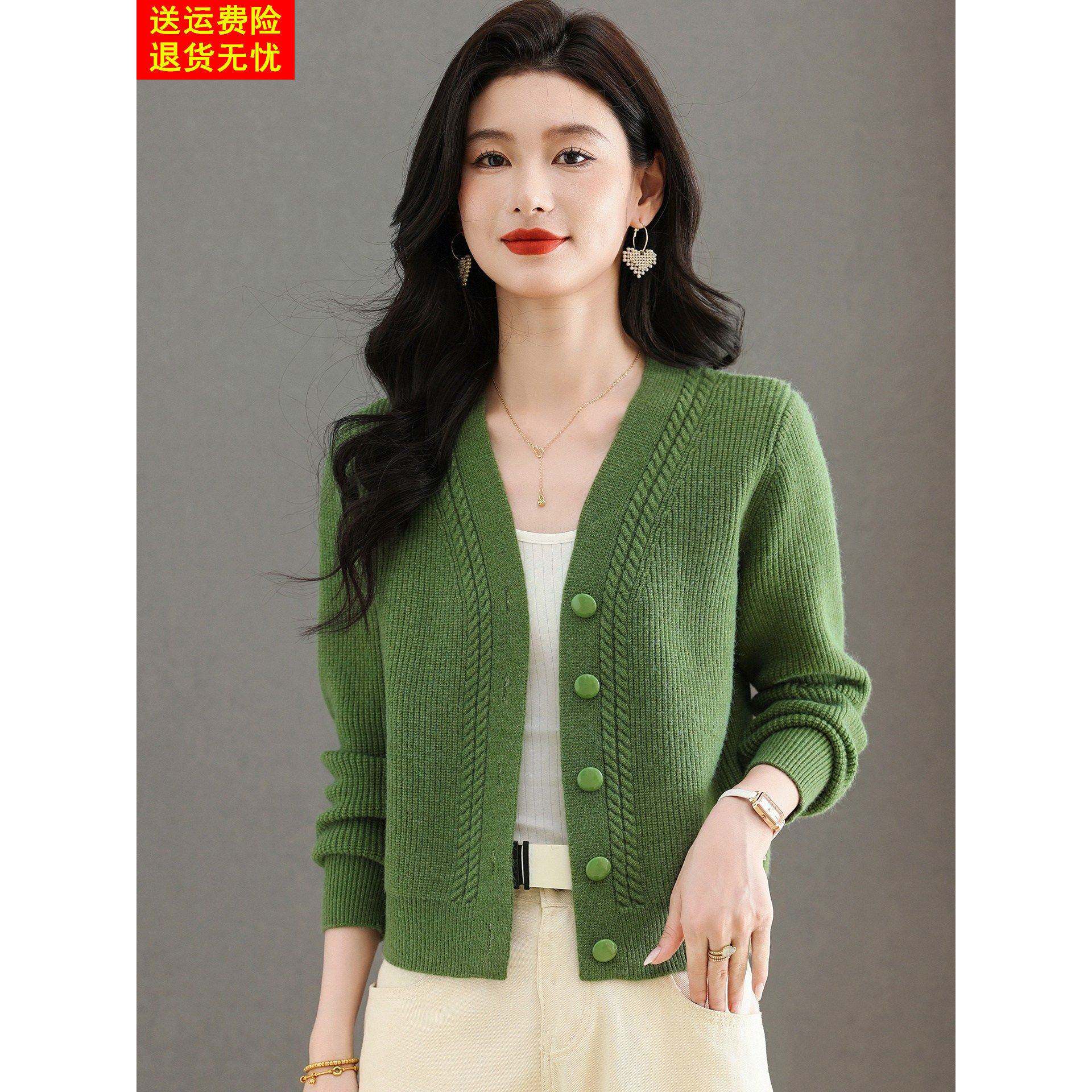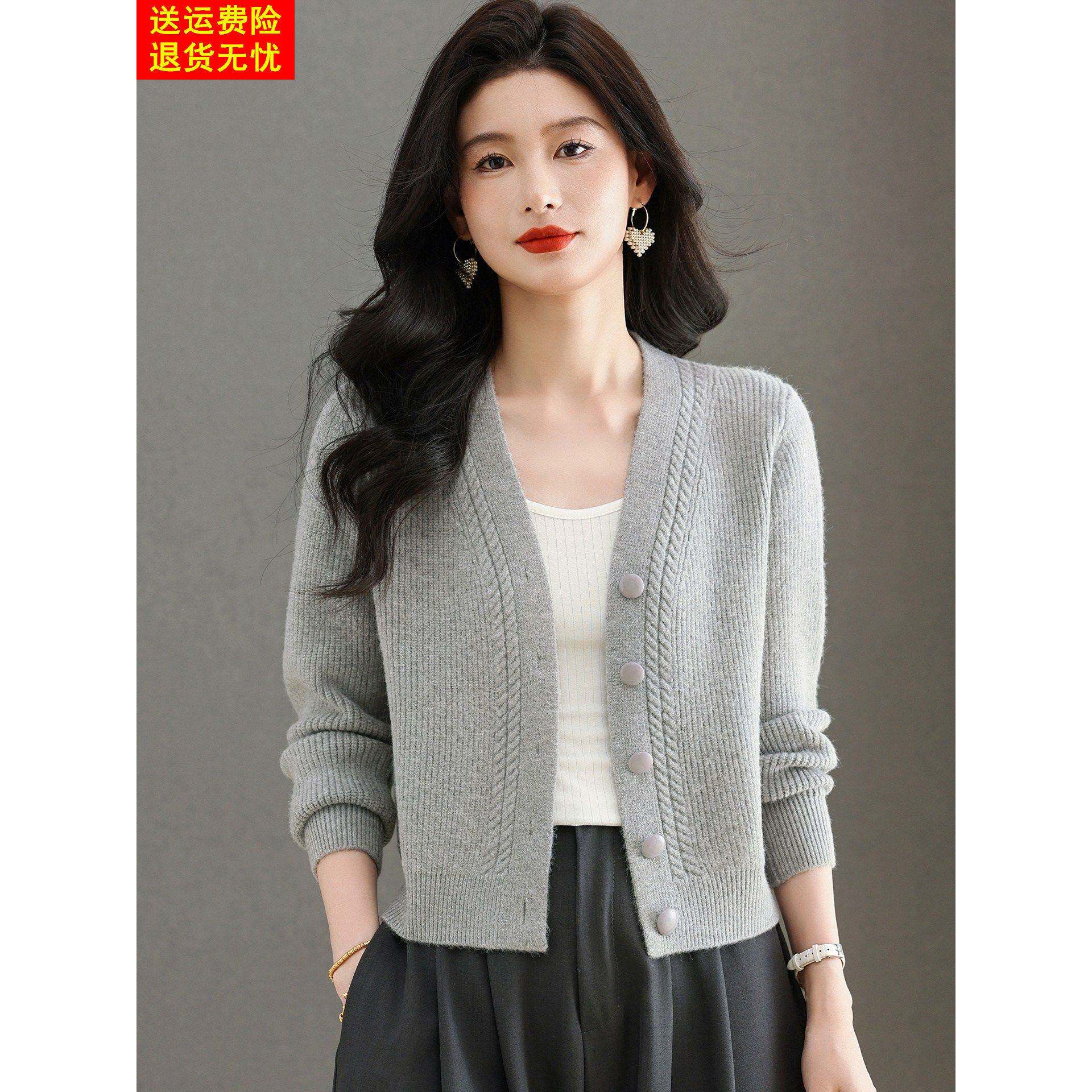 鄂尔多斯市羊毛衫针织开衫女短款配裙子外搭减龄羊绒V领毛衣外套