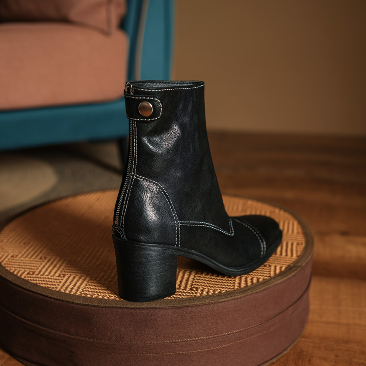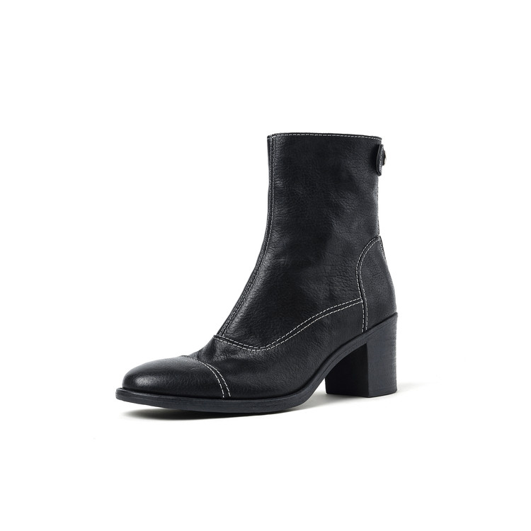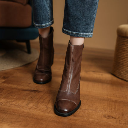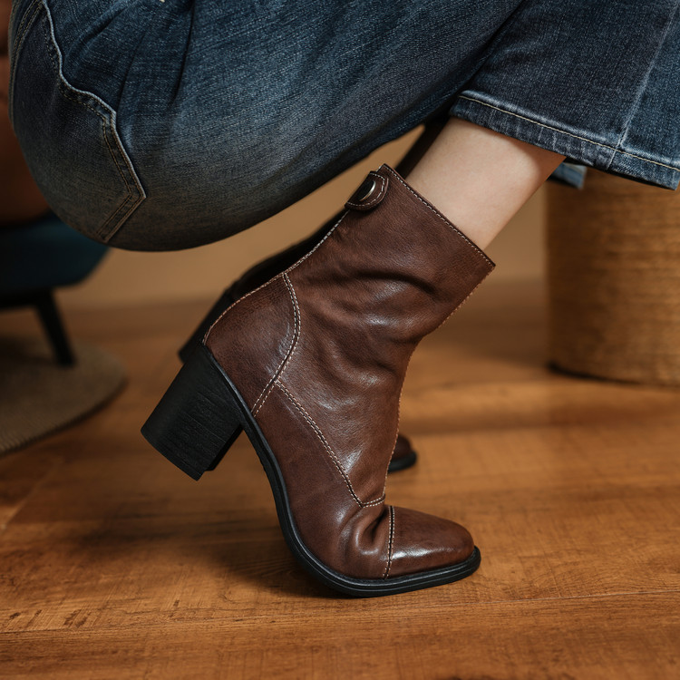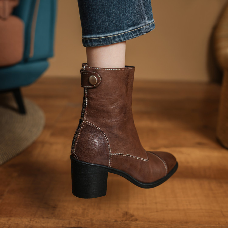 复古粽色时髦真皮粗跟短筒时装靴子马皮方头时尚短靴女气质单靴子