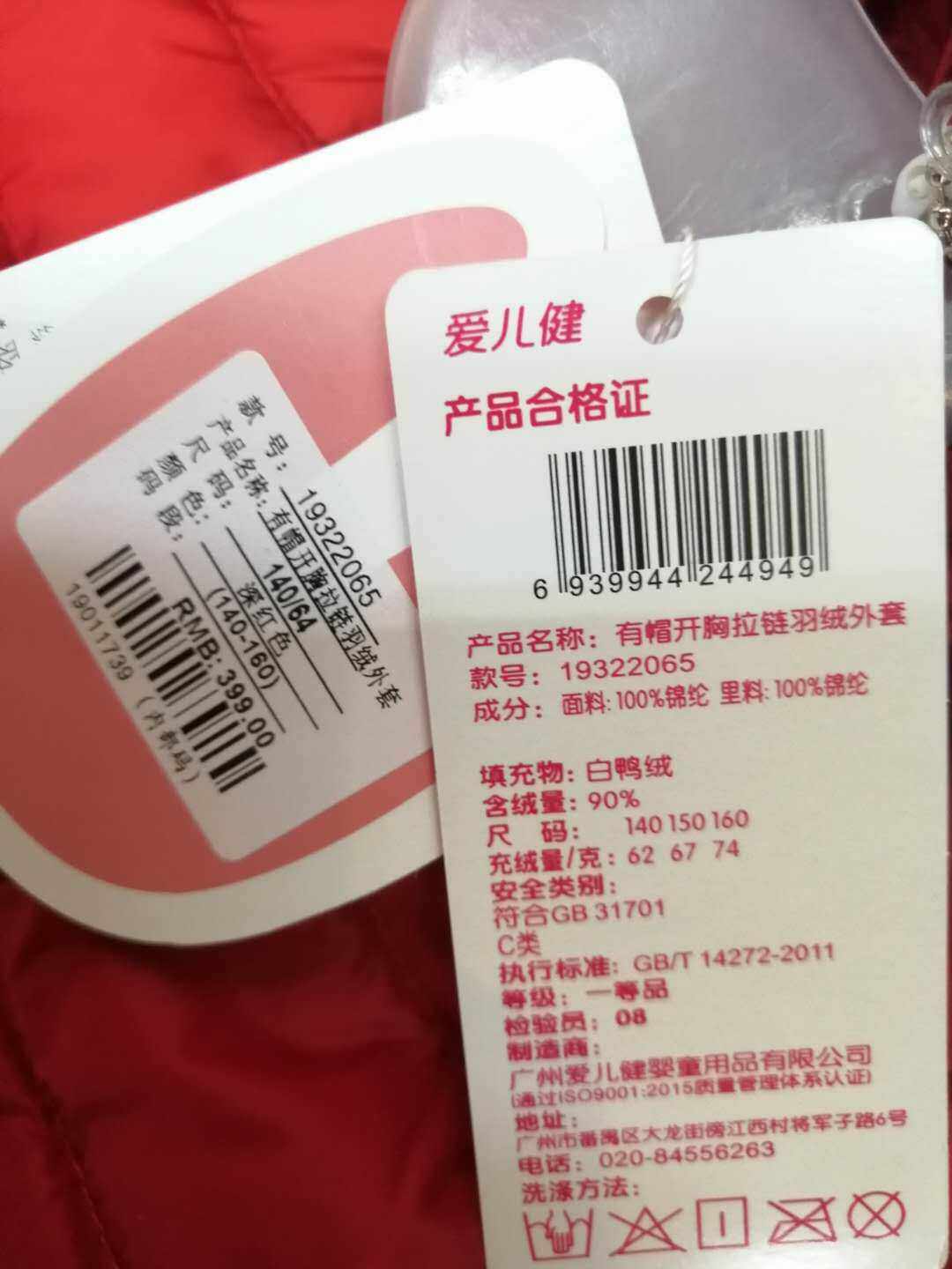 3.9折1爱儿健品牌童装19322065女童秋冬装有帽开胸拉链羽绒服外套