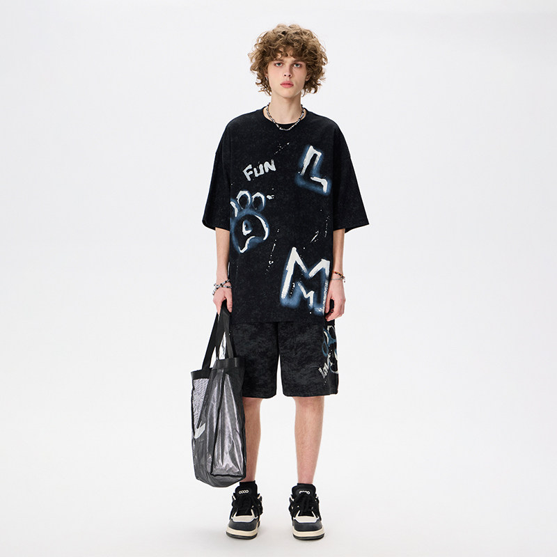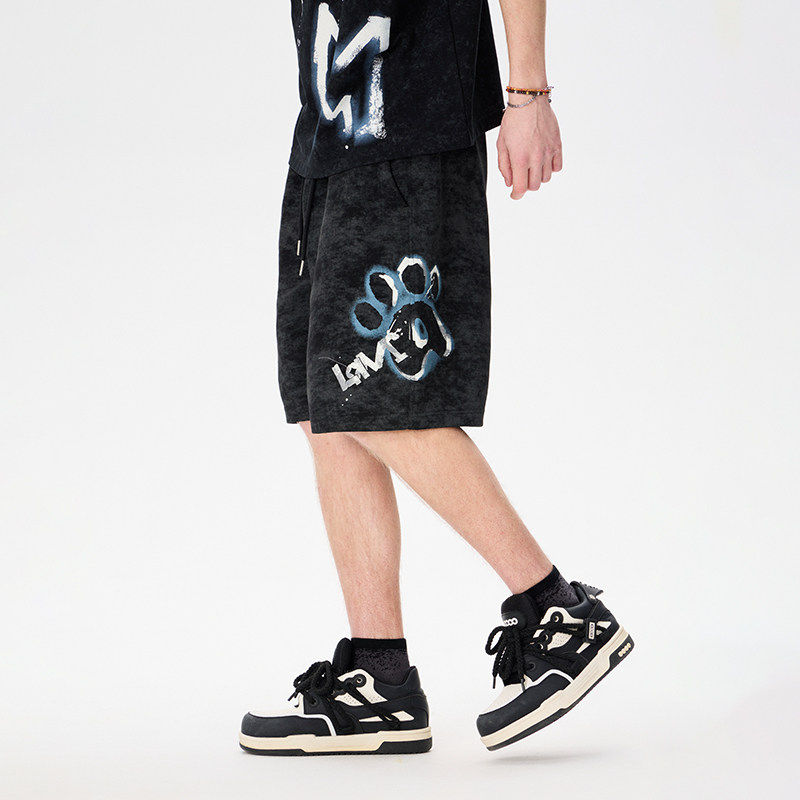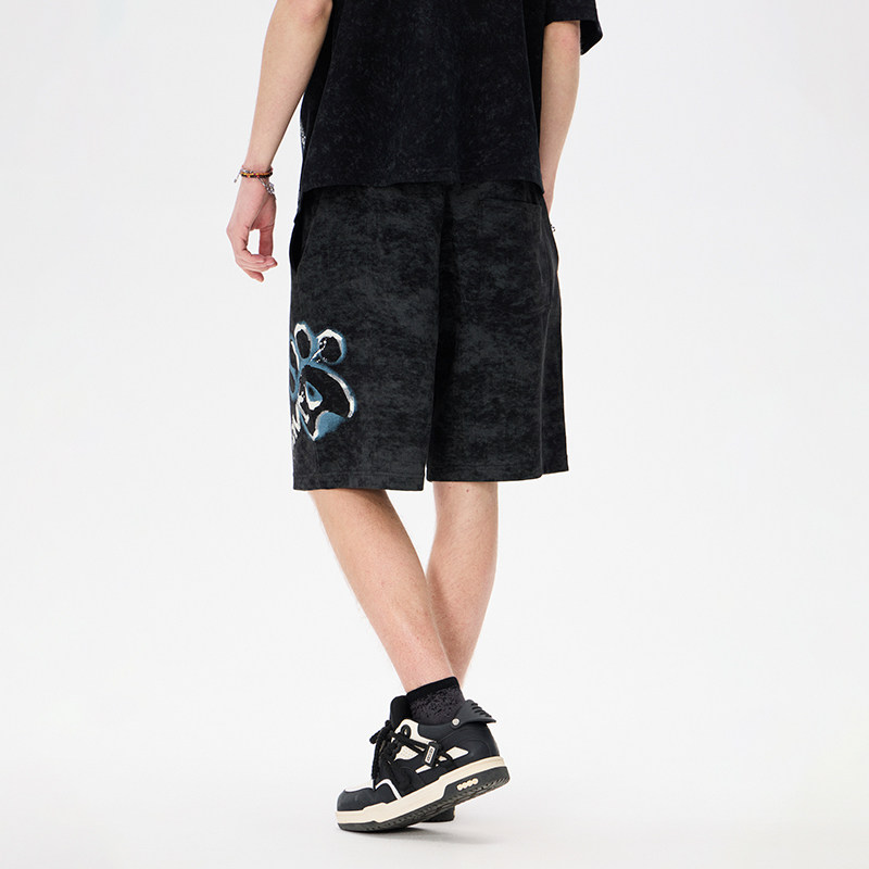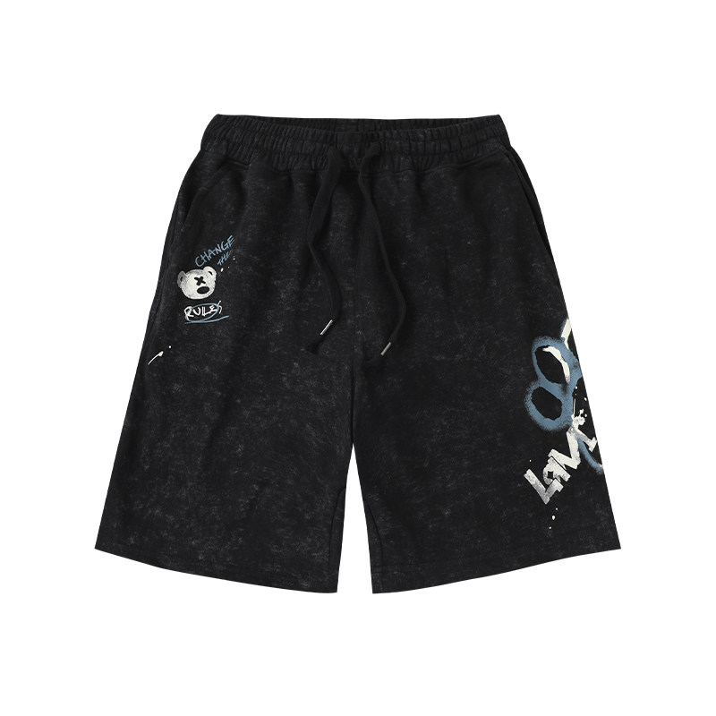LAMLICKA黑色休闲短裤男夏季美式仿洗水复古宽松运动设计感五分裤