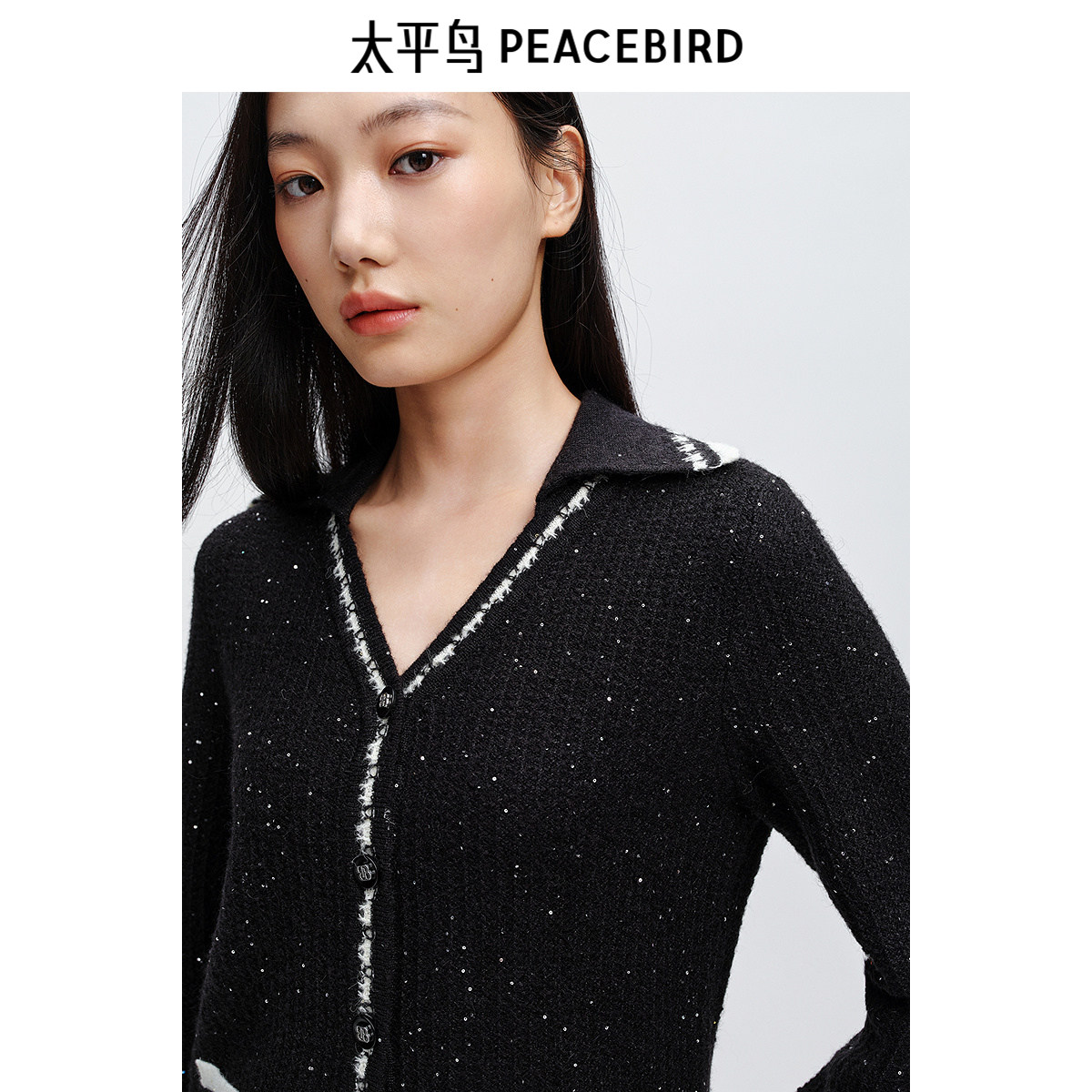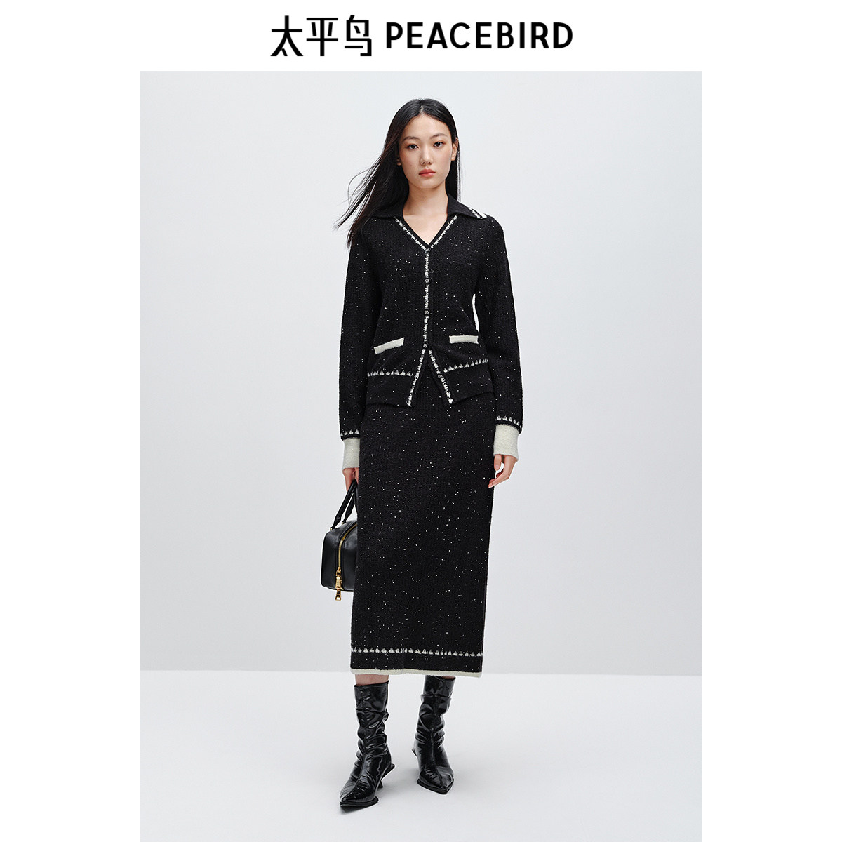 太平鸟小香风精致优雅翻领羊毛针织开衫中长款珠片点缀半身裙套装