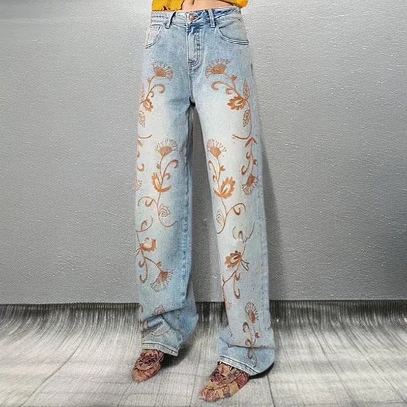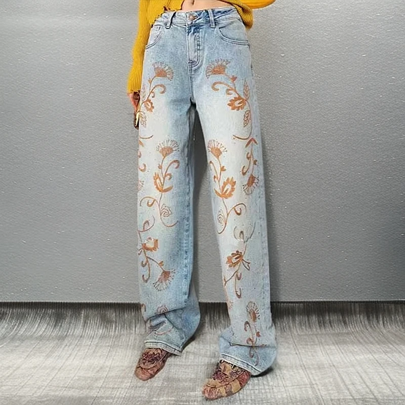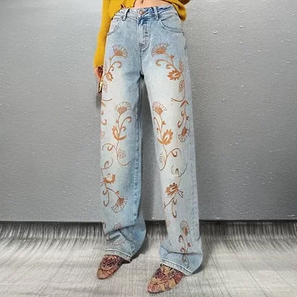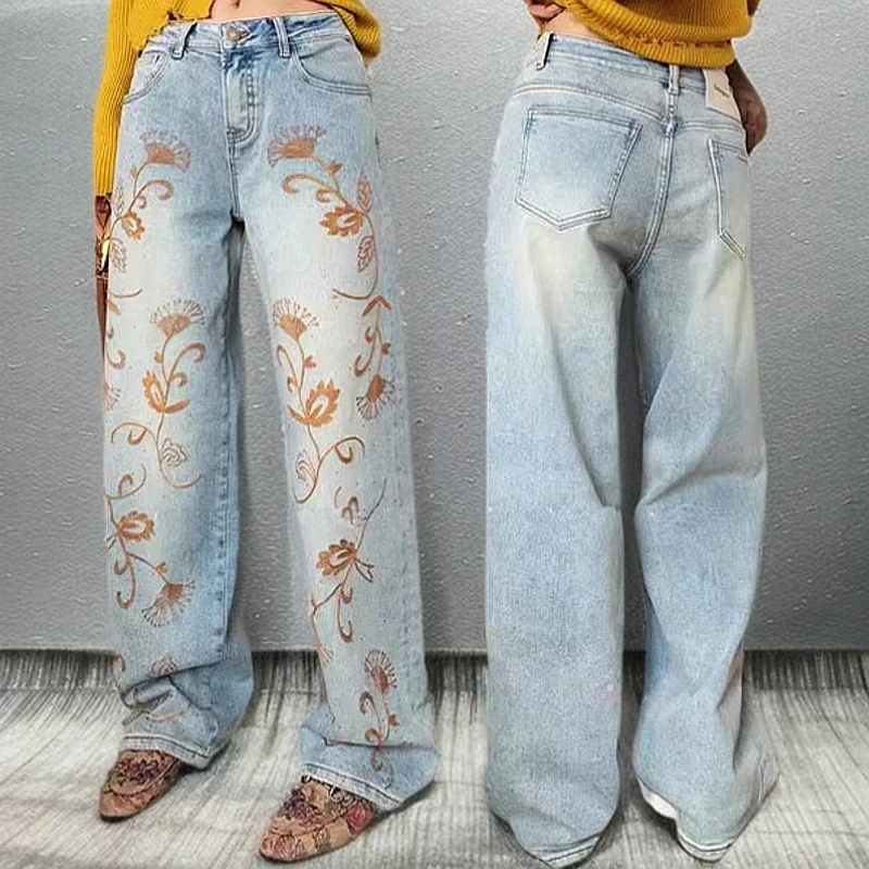 欧洲站欧货2025秋季新款刺绣花朵重工牛仔裤女高腰显瘦宽松阔腿裤