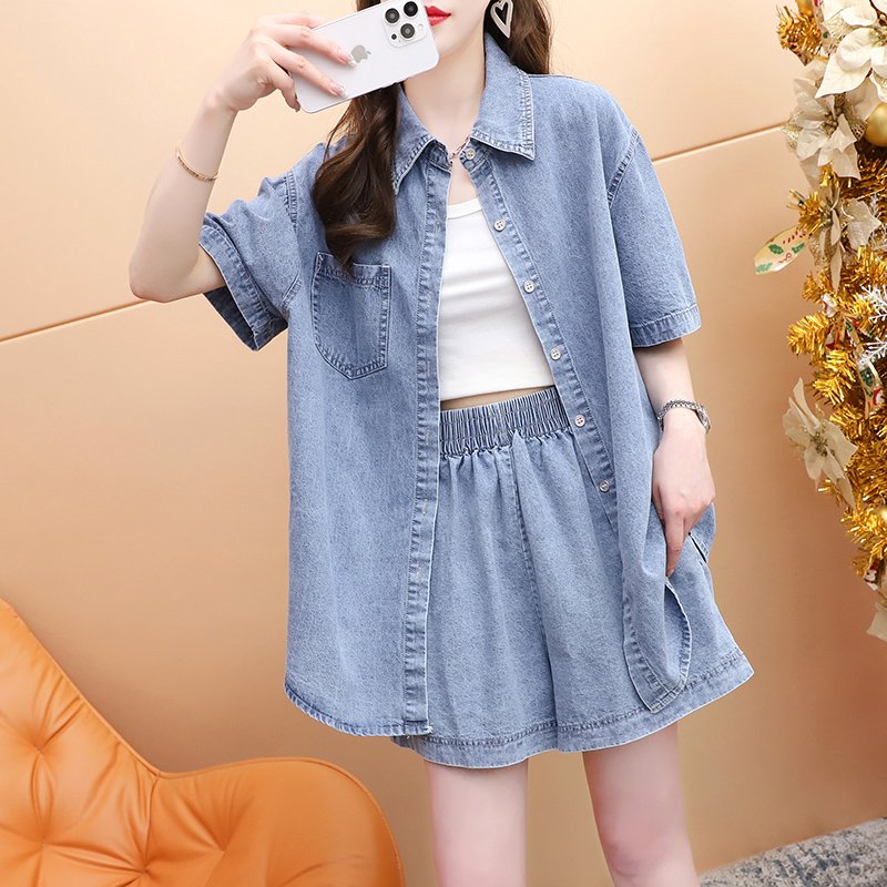 潮牌牛仔衬衫短裤两件套女新款夏季宽松休闲洋气网红炸街职业套装