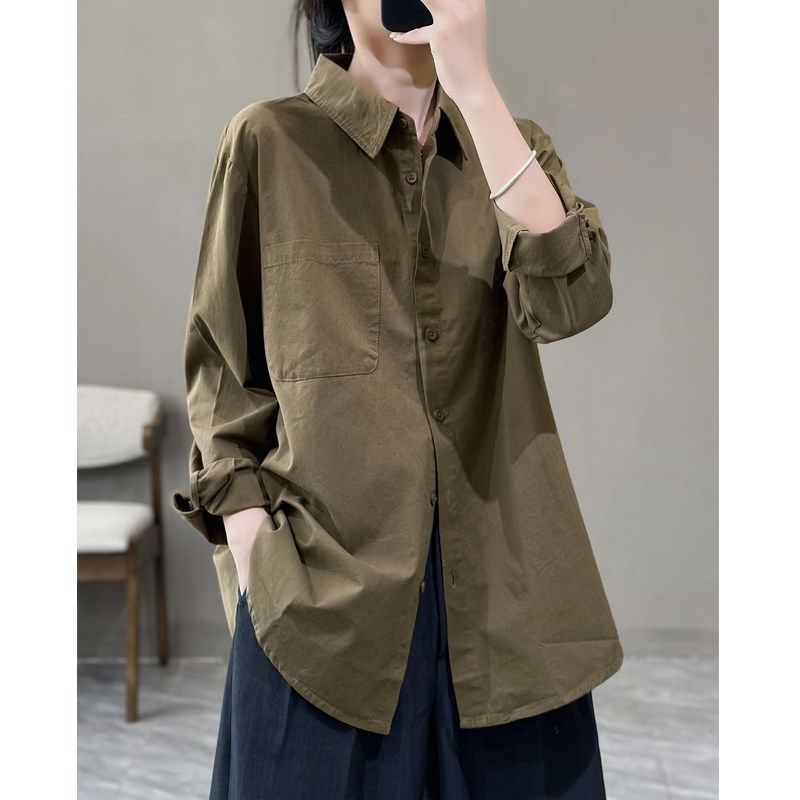 休闲时尚文艺大码中长款衬衫女2024春秋新款全棉百搭宽松长袖上衣