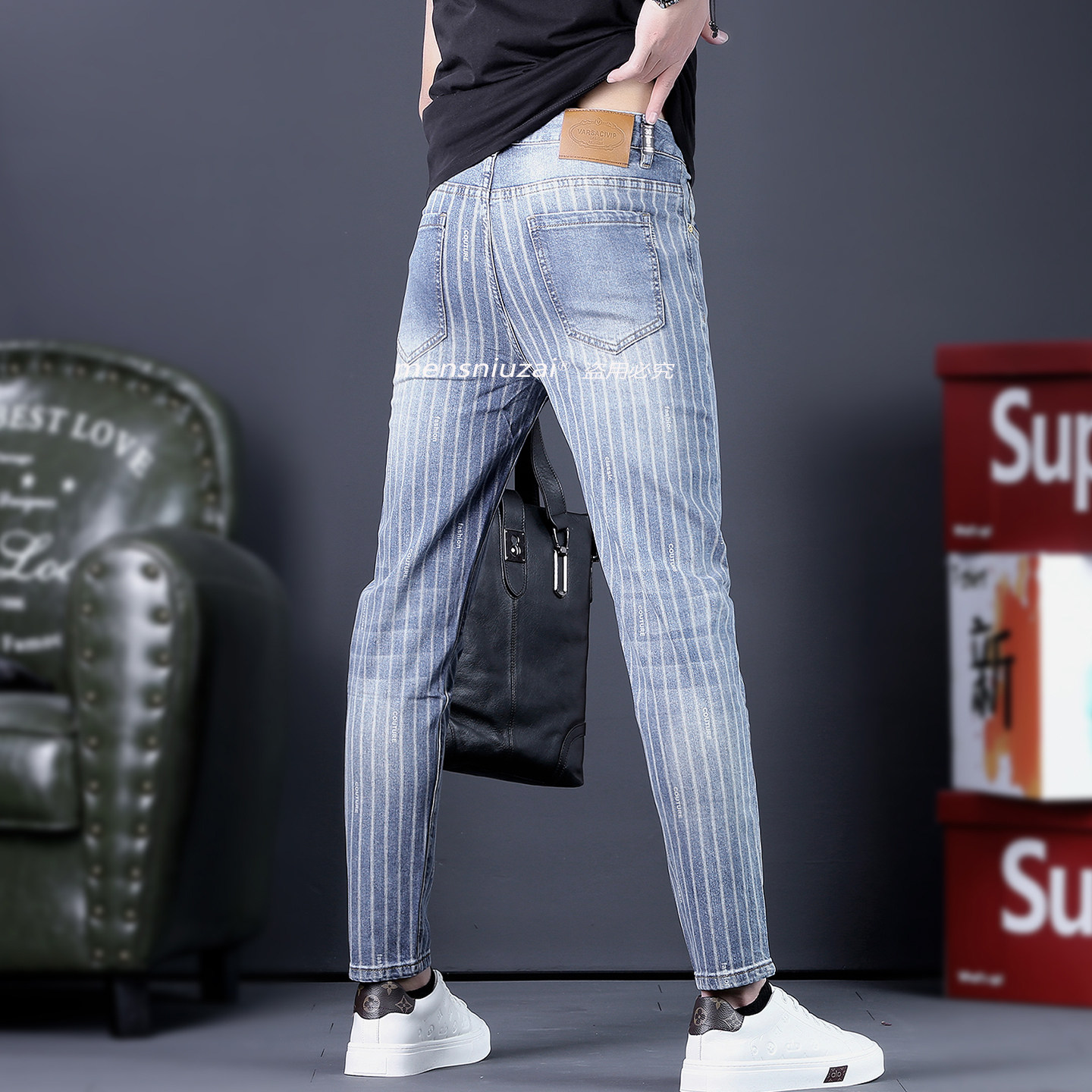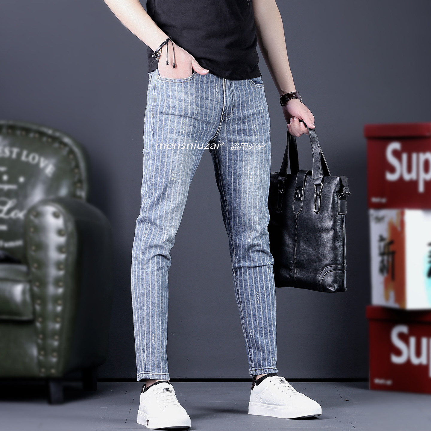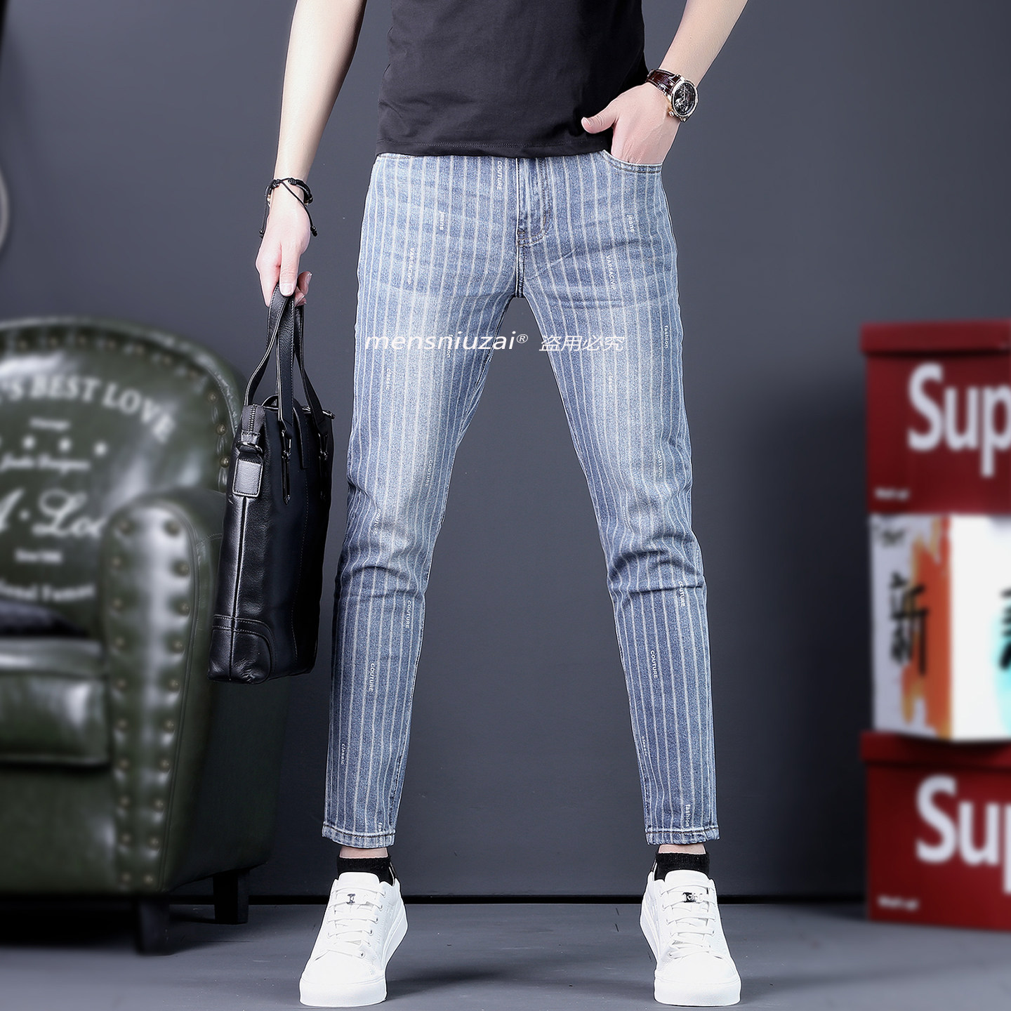 2026新款高端男士条纹牛仔裤春夏季修身弹力长裤潮流休闲男9分裤